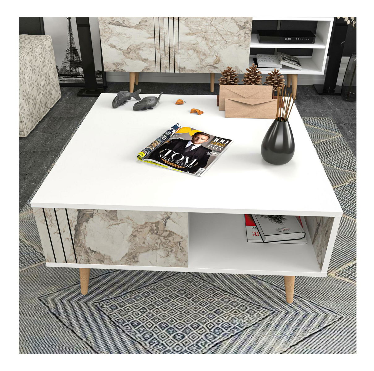 Măsuță de cafea Ronasotta 1 (alb + piatră + Lemn)