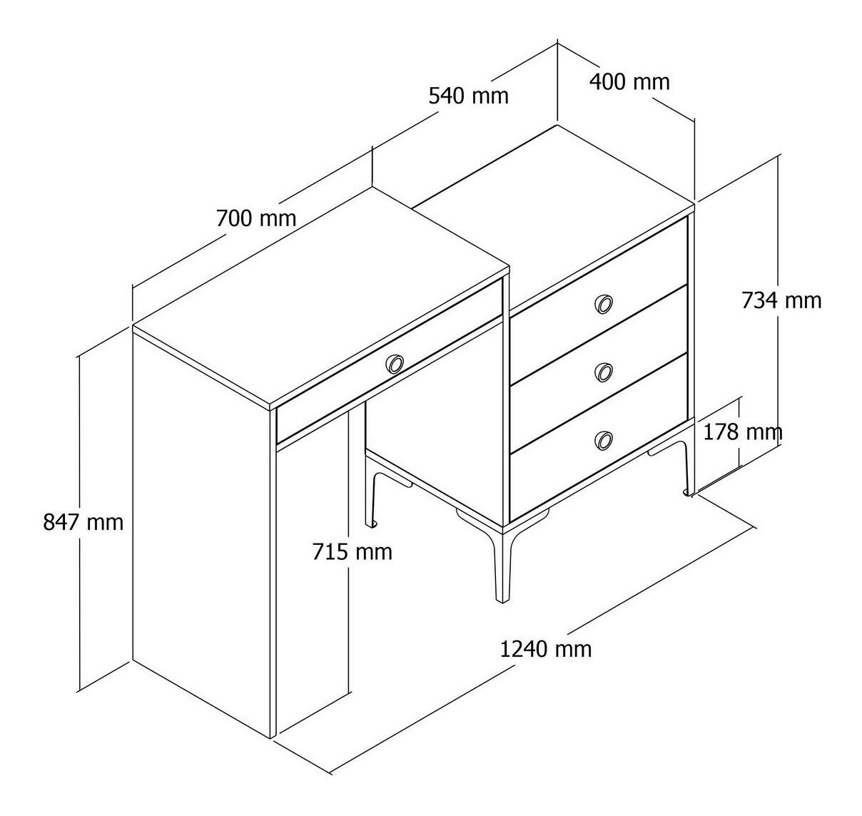 grosime: 18 mm, mâner metalic picioare metalice, dimensiuni comodă: lățime: 124 cm, înălțime: 84,7 cm, adâncime: 40 cm, înălțime picioare: 17,8 cm