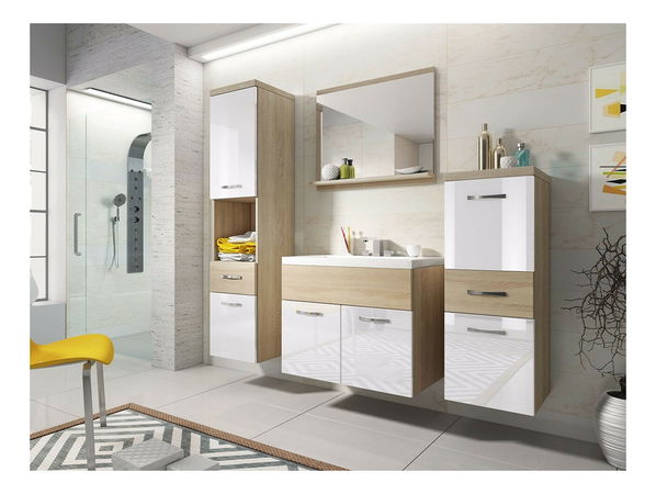 Mobilier baie Lunara (stejar sonoma + stejar sonoma + Alb lucios ) (cu sifon, cu baterie Platino)