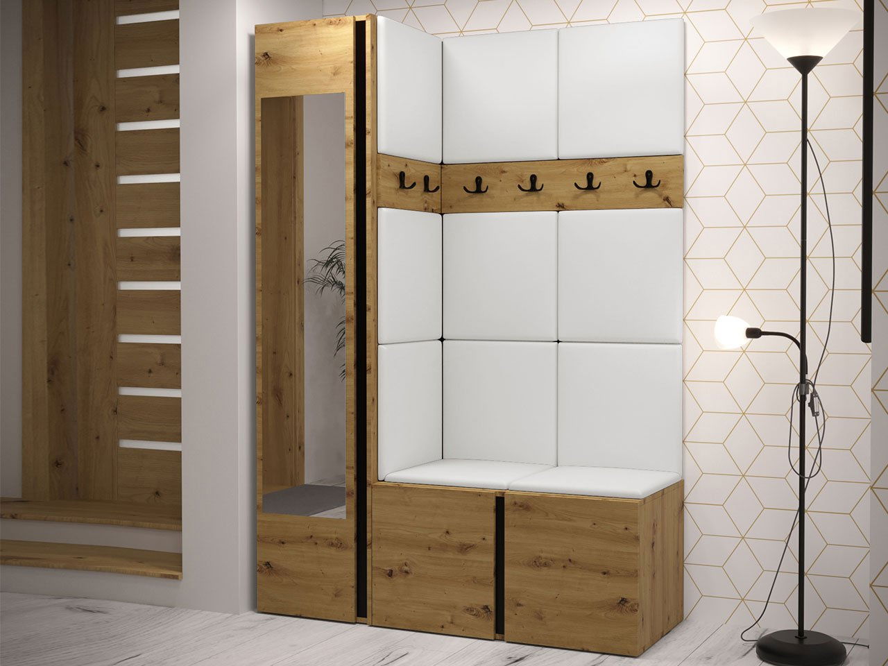 Descoperă mobilierul pentru hol Tovenaz X, o combinație ideală de funcționalitate și design modern, realizat în nuanțe armonioase de stejar artisan, negru și alb. Acest ansamblu compact include o oglindă generoasă care sporește utilitatea spațiului, oferindu-ți posibilitatea de a te aranja perfect înainte de plecarea din casă. Panourile tapițate cu material de calitate adaugă confort și un aspect primitor, transformând holul într-un loc plăcut și practic.