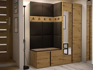 Descoperă mobilierul de hol Tovenaz XII, realizat din stejar artisan cu accente negre și verde deschis. Acest set atrage priviri prin combinația sa modernă și rafinată. Spațiul său generos este ideal pentru holurile mari, oferind o șatnivă încăpătoare cu oglindă integrată, perfectă pentru ultimele retușuri înainte de a ieși din casă.