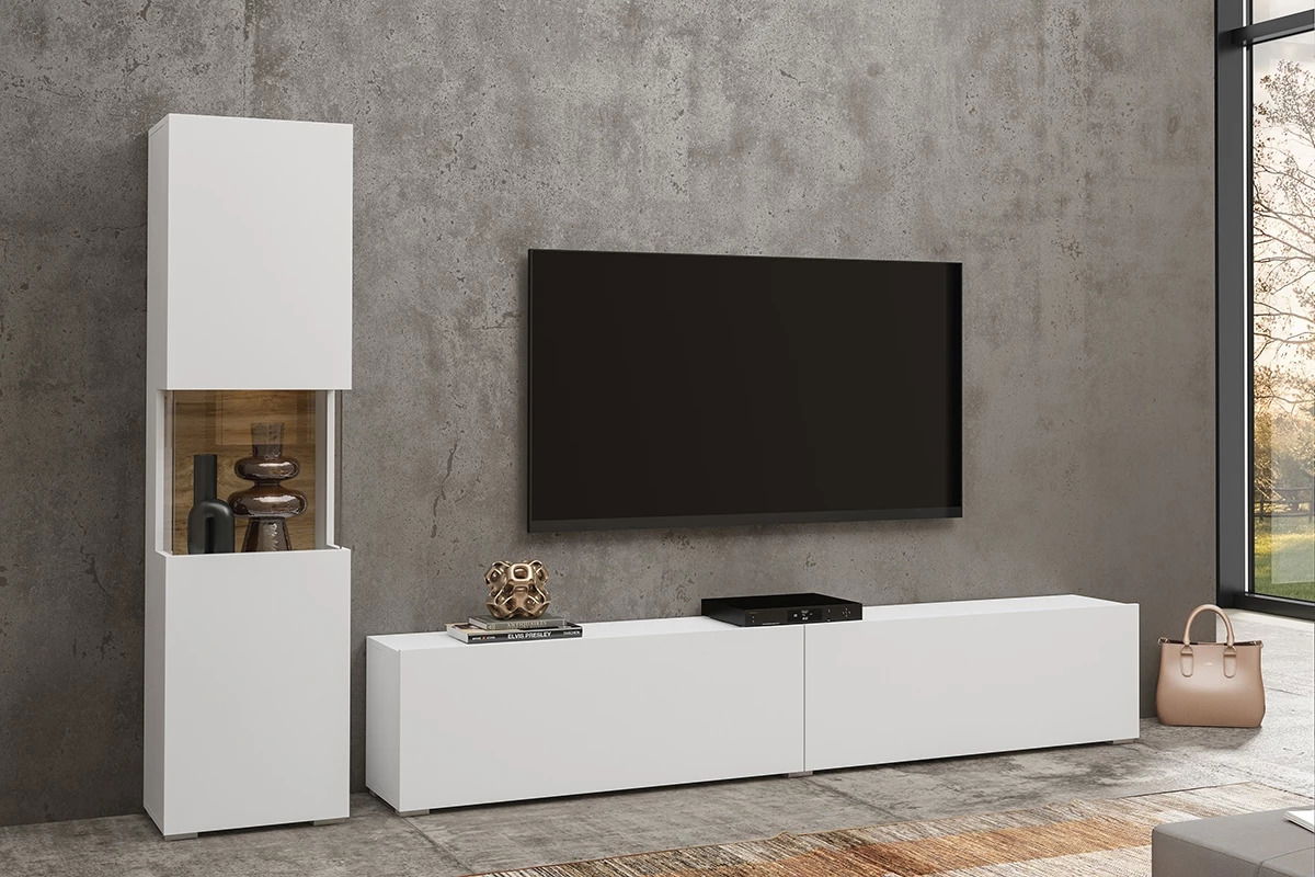 Descoperiți mobilierul living Avernic Typ 09, o combinație între modernitate și funcționalitate, realizată în alb impecabil și accente din stejar Wotan care adaugă căldură și naturalețe oricărui spațiu. Această coloană este compusă din vitrina Typ 05 și TV-șifonierul Typ 40, oferind o soluție ideală pentru organizarea și expunerea obiectelor decorative, dar și pentru depozitarea discretă a accesoriilor media.