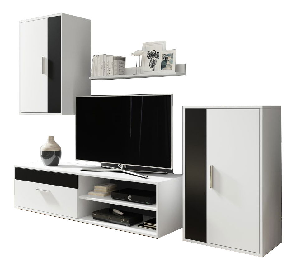AfișeazăMobilier cameră de zi Berno simplu și modern. Livingul conține două dulapuri, o masă TV și un raft. Dulapul suspendat și comoda au spațiu de depozitare separat de un raft oferind astfel două locuri de depozitare.