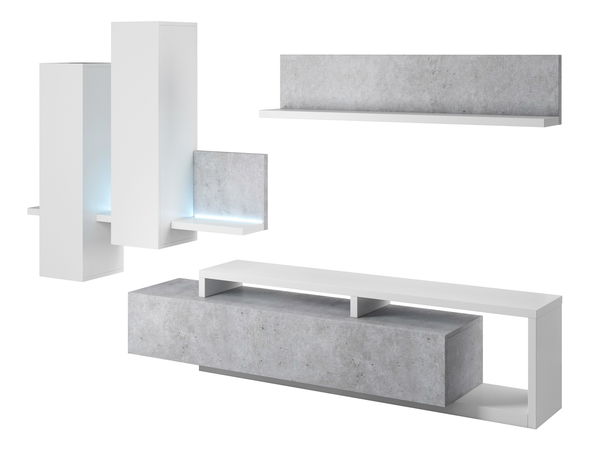 Mobilierul cameră de zi cu desgin modern a cărui parte componentă este și iluminatul LED. Este fabricat din pal laminat pe versiunea color de Colorado beton + alb, rezistent la zgârieturi.