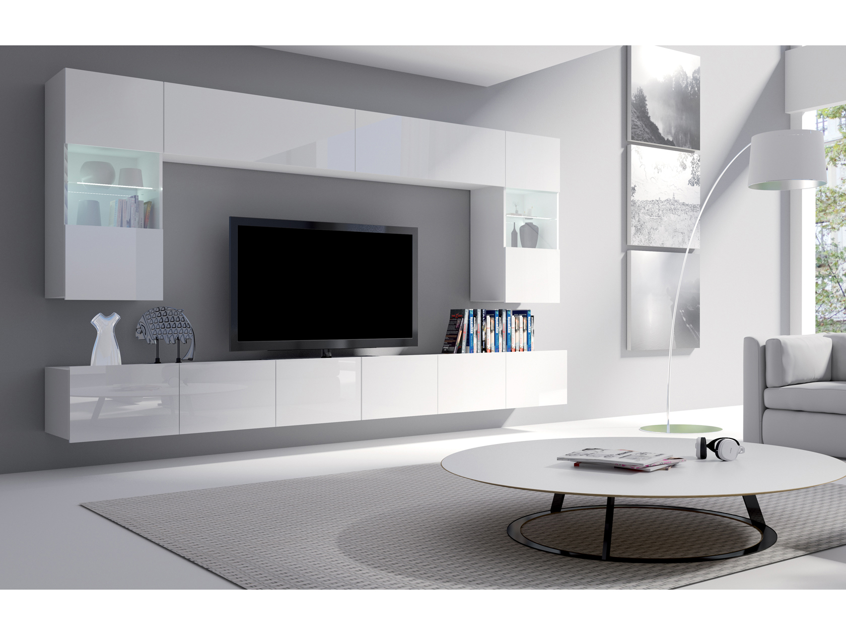 Mobilierul living conține 6 elemente: 2x vitrină suspendată, 2x raft a 2x Masă TV 150. Iluminatul LED poate fi achiziționat pe 3 culori: alb, albastru marin sau portocaliu.