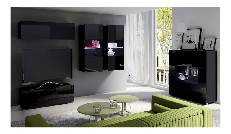 Mobilierul living conține 7 elemente: 2x raft, 1x Masă TV150, 1x Masă TV100, 1x comodă, 2x raft suspendat P50.Iluminatul LED poate fi achiziționat pe 3 culori: alb, albastru marin sau portocaliu.