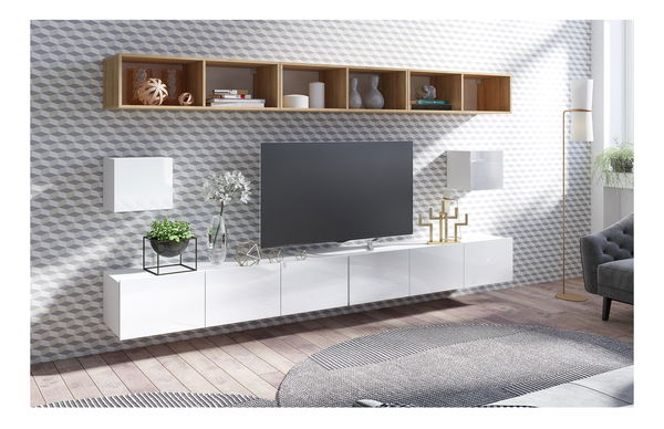 Mobilierul living conține 7 elemente: 2x Masă TV RTV 150, 2x Dulap suspendat KWADRAT a 3x Raft suspendat P100.