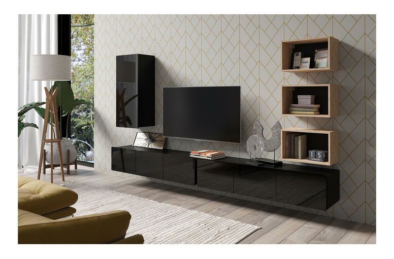 Mobilierul living conține 6 elemente: 1x vitrină suspendată, 3x raft, 1x Masă TV 150 a 1x Masă TV 100. Iluminatul LED poate fi achiziționat pe 3 culori: alb, albastru marin sau portocaliu.