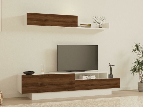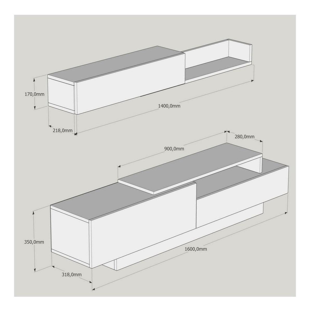 grosime: 18 mm, dimensiuni unitate TV: lățime: 160 cm, înălțime: 35 cm, adâncime: 31,8 cm, lățime TV raft: 90 cm, dimensiuni raft de perete: lățime: 140 cm, înălțime: 17 cm, adâncime: 21,8 cm