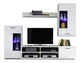 Mobielierul living de design Frontal 1 în nuanțe de alb cu vitrine și iluminare LED atractivă de culoare albastru-mov.
