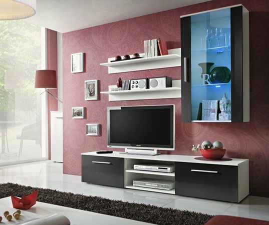 Mobilierul living Galino E are dimensiuni modeste, dar oferă suficient spațiu de depozitare. Pentru un efect unic recomandăm achiziția iluminatului LED.