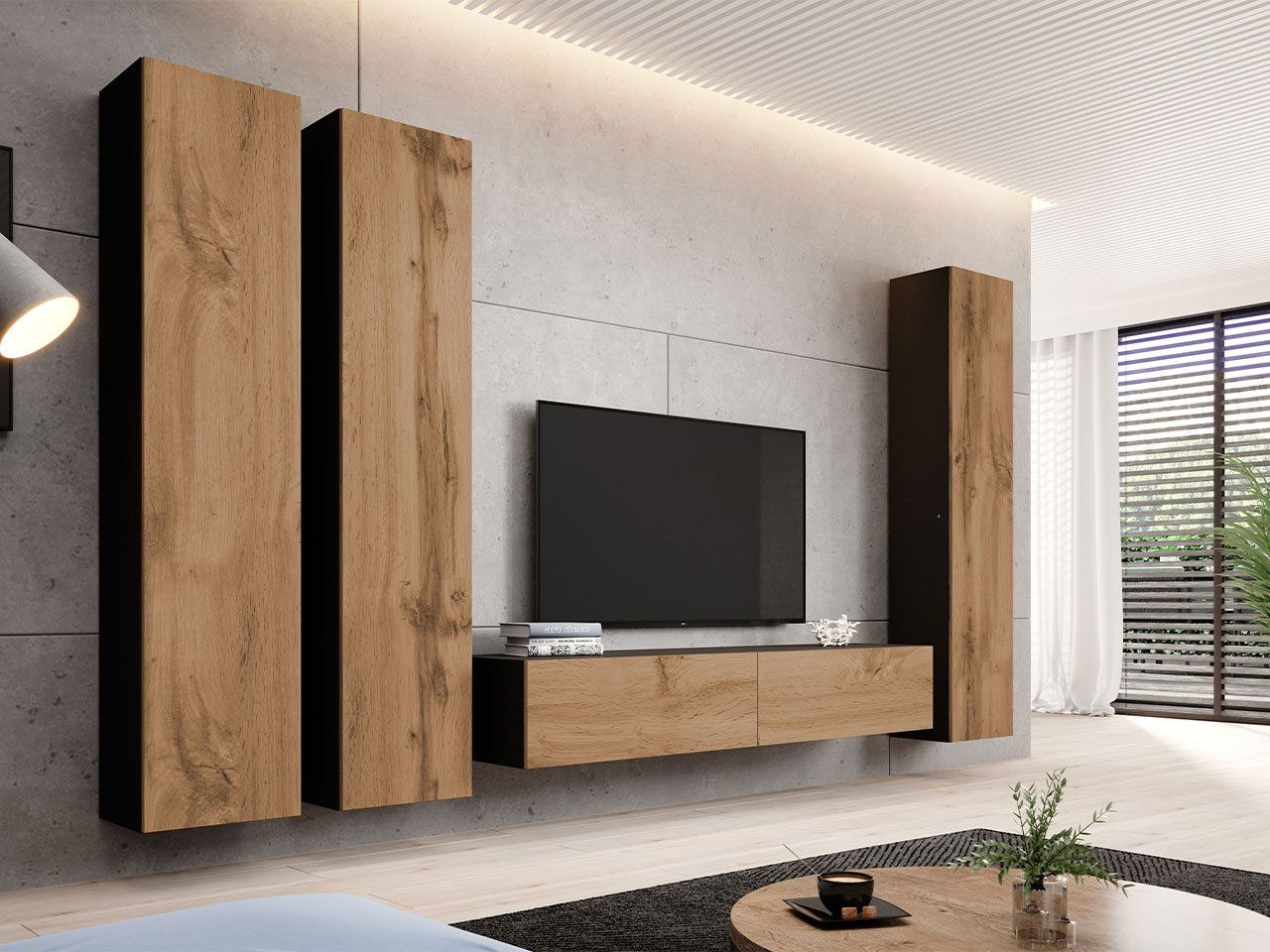 Descoperă mobilierul pentru living Ziggy, un set care îmbină funcționalitatea și designul modern, ideal pentru spațiile mici și pentru iubitorii de minimalism. Combinația rafinată de negru cu fronturi din lemn Wotan aduce un contrast plăcut, conferind căldură și stil încăperii tale.