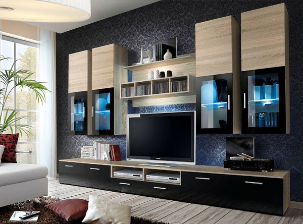 Mobilier living Lyra cu un design elegant, modern și deasemenea foarte practic, deoarece oferă suficient spațiu de depozitare. Vitrinele sunt iluminate cu LEDuri. Este fabricat din pal laminat. Piesele din sticlă sunt din sticlă securizată.