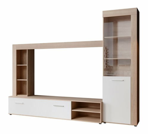 Mobilierul living Loqi în combinația de culori non-violente de alb și stejar sonoma deschis este în prezent o tendință dorită. Mobilierul conține patru elemente - 1x vitrină înaltă cu uși pline, 1x masa TV, 1x raft deasupra televizorului, 1x raft jos. Mobilierul este fabricat din PAL.