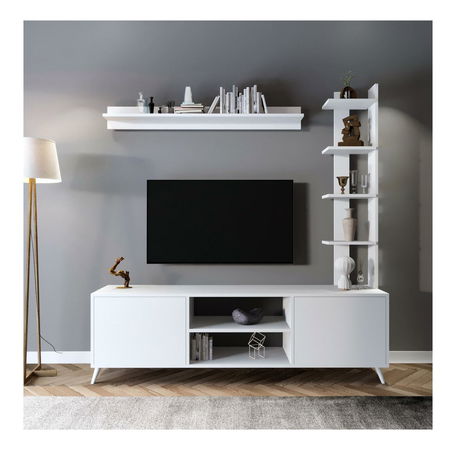 grosime: 18 mm, dimensiuni cadru TV: lățime: 180 cm, înălțime: 180 cm, adâncime: 40 cm, înălțime raft lateral: 30 cm, lățime raft de perete: 130 cm, înălțime picioare: 10 cm