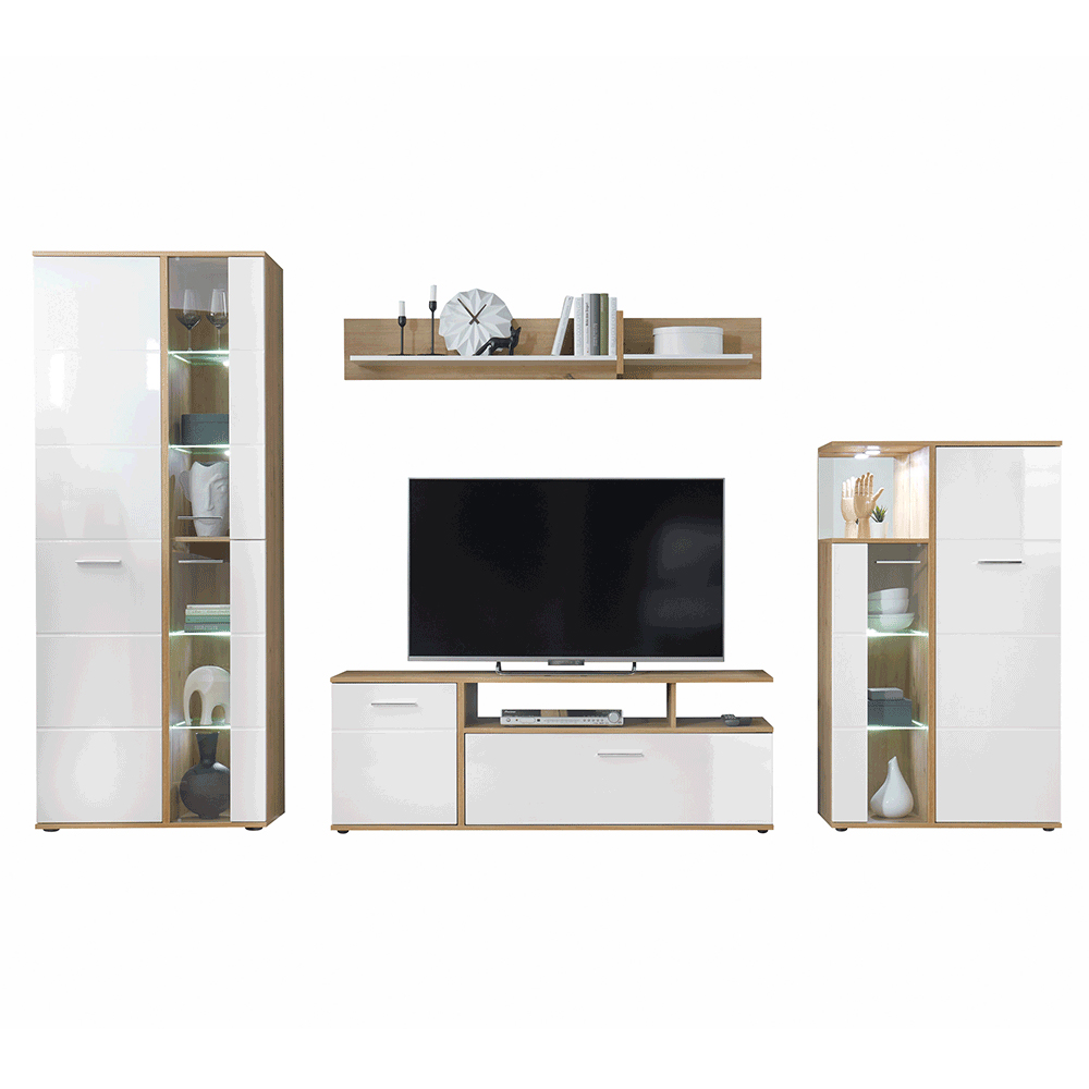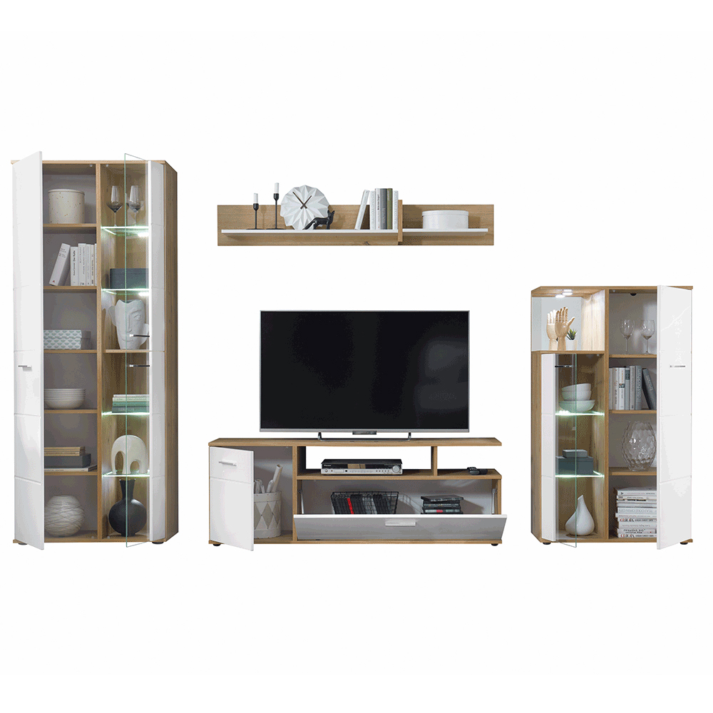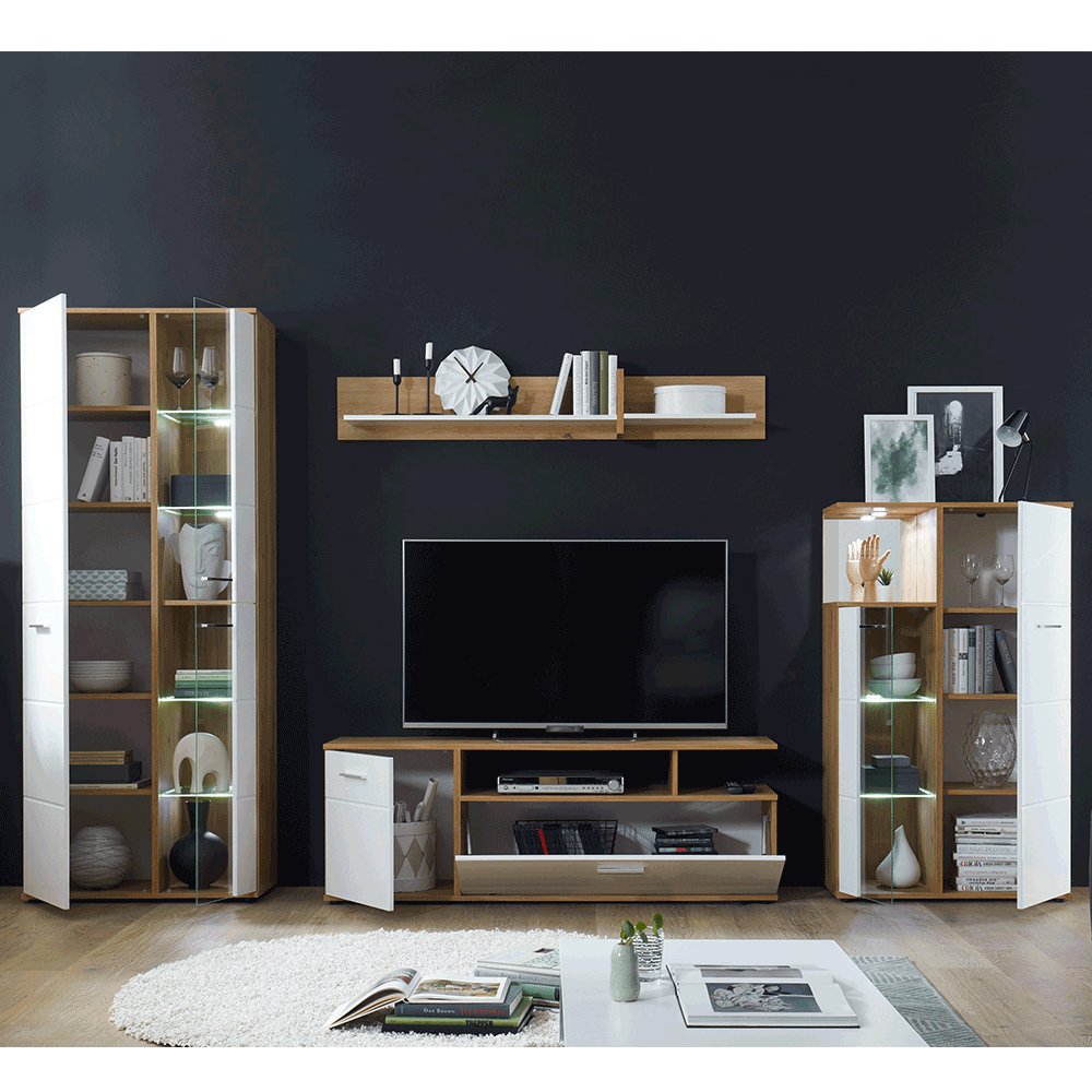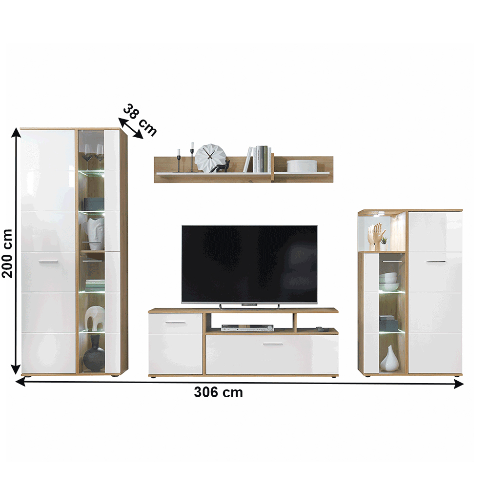 Mobilier living Ralano (alb ultralucios + stejar artisan) (Cu iluminat LED)