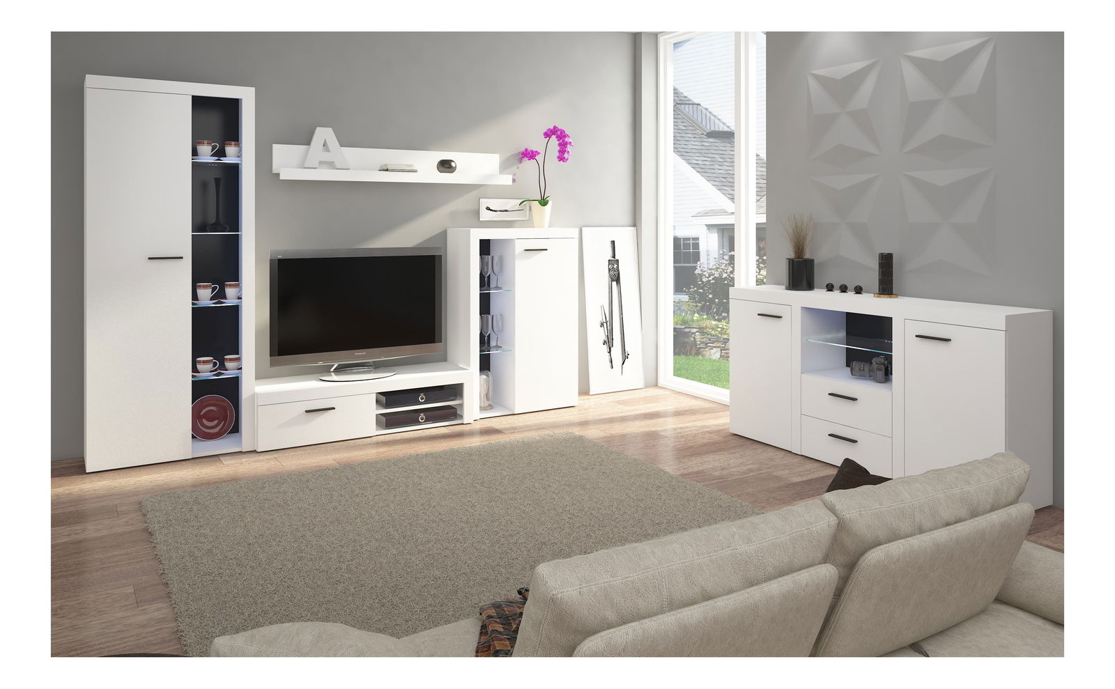 Descoperiți mobilarea perfectă pentru livingul dvs. cu ansamblul Rudby în alb, o soluție modernă și funcțională care aduce un aer proaspăt oricărui spațiu. Combinând un design minimalist cu un finisaj impecabil, această cameră de zi include patru piese versatile ce oferă spațiu generos de depozitare pentru echipamente audio-video, cărți sau obiecte decorative.