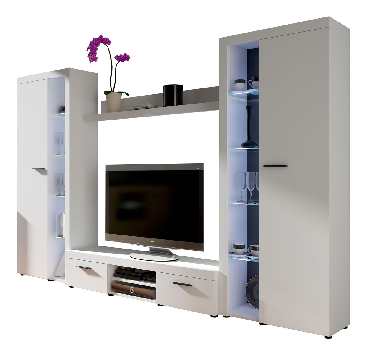Descoperă ansamblul mobilier living Rudby XL în finisaj alb, o soluție modernă și funcțională pentru amenajarea spațiului tău de zi. Cu o înălțime de 190 cm și adâncimi variabile între 33,8 și 40,2 cm, această compoziție este ideală pentru depozitarea eficientă și organizarea obiectelor. Setul include două corpuri înalte cu spații vitrate pentru expunerea elegantă a decorațiunilor, un raft suspendat versatil și un TV suport cu compartimente practice pentru echipamente media.