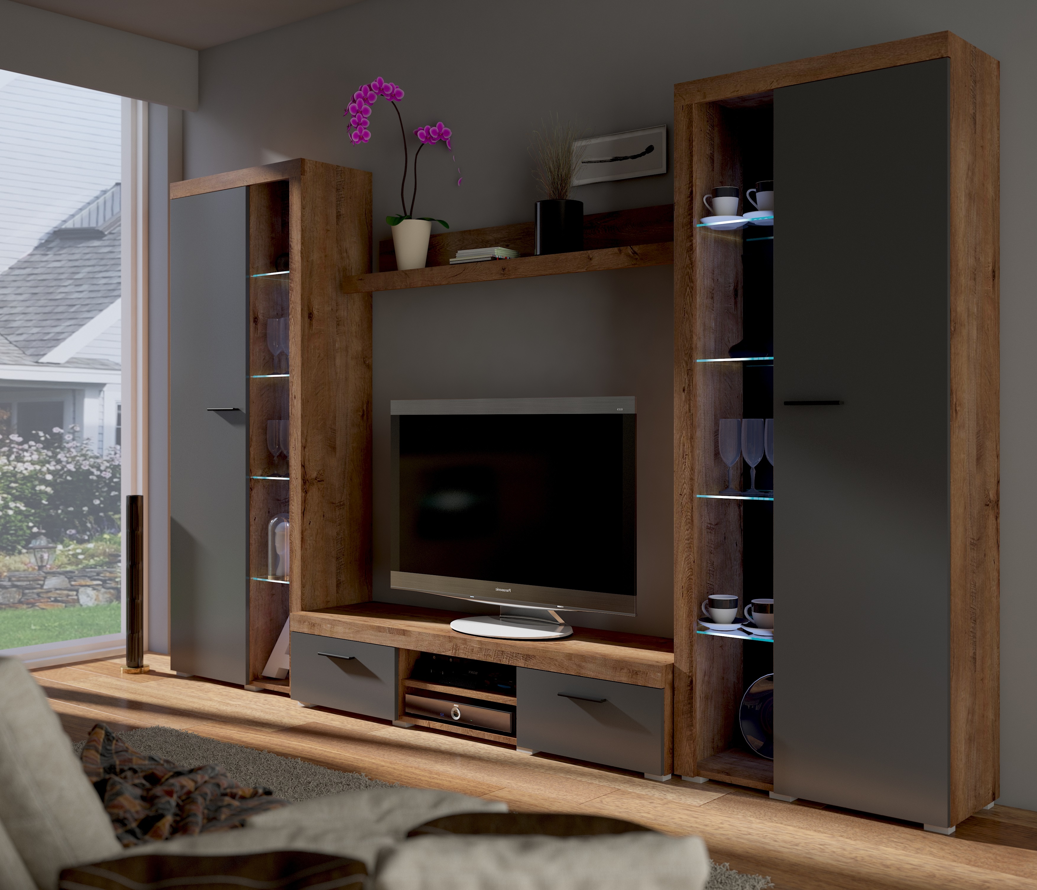 Mobilierul living conține patru elemente. Masa TV cu uși rabatabile și un spațiu deschis pentru echipamentele AV. Vitrina înaltă are trei rafturi de lemn în spatele ușii și patru rafturi de sticlă deschide. Mobilierul living este completat de un raft de perete. Iluminatul LED poate fi comandat la preț suplimentar.