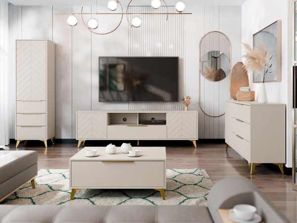 Finisajul în tonuri calde de bej, împreună cu detaliile subtile în formă geometrică, transformă încăperea într-un spațiu aerisit și primitor, ușor de integrat în diverse stiluri de amenajare, de la modern minimalist la scandinav. Elementele metalice aurii, precum picioarele și mânerele, adaugă caracter și stabilitate, iar suprafața rezistentă asigură durabilitate pe termen lung.