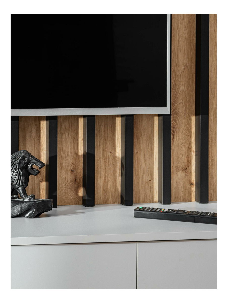 Mobilierul ASM Vertic, în combinația elegantă de stejar artisan și perla gray, aduce un design unic cu lamelă stilizată din lemn natural, care oferă textură și căldură încăperii. Corpul suspendat, în nuanță deschisă de gri perlat, echilibrează liniile curate și minimaliste, creând un aspect aerisit și modern.