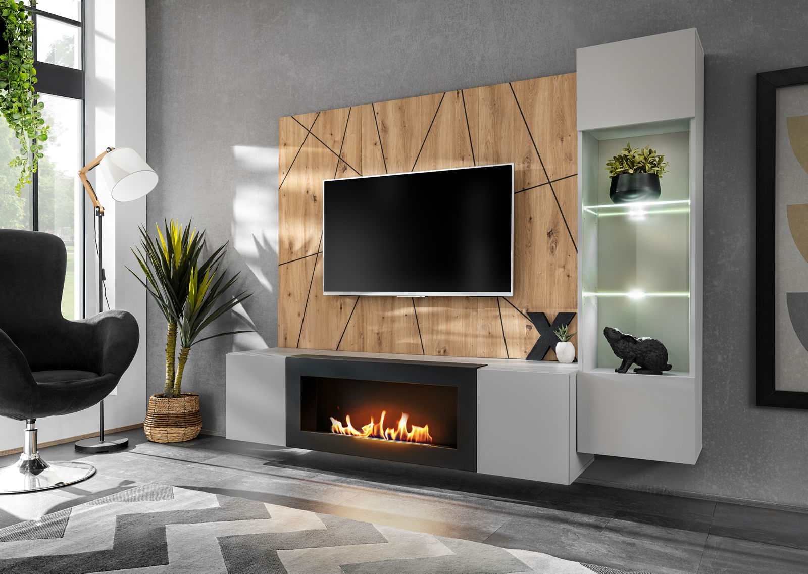 - Xavus G-K (perla grey + stejar artisan) (cu iluminat) (cu șemineu bio)