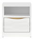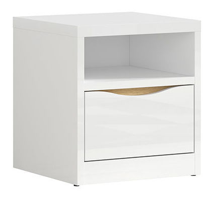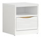 AfișeazăNoptieră modernă cu un design specific, care conține 1 raft deschis și 1 sertar pe șine cu role.