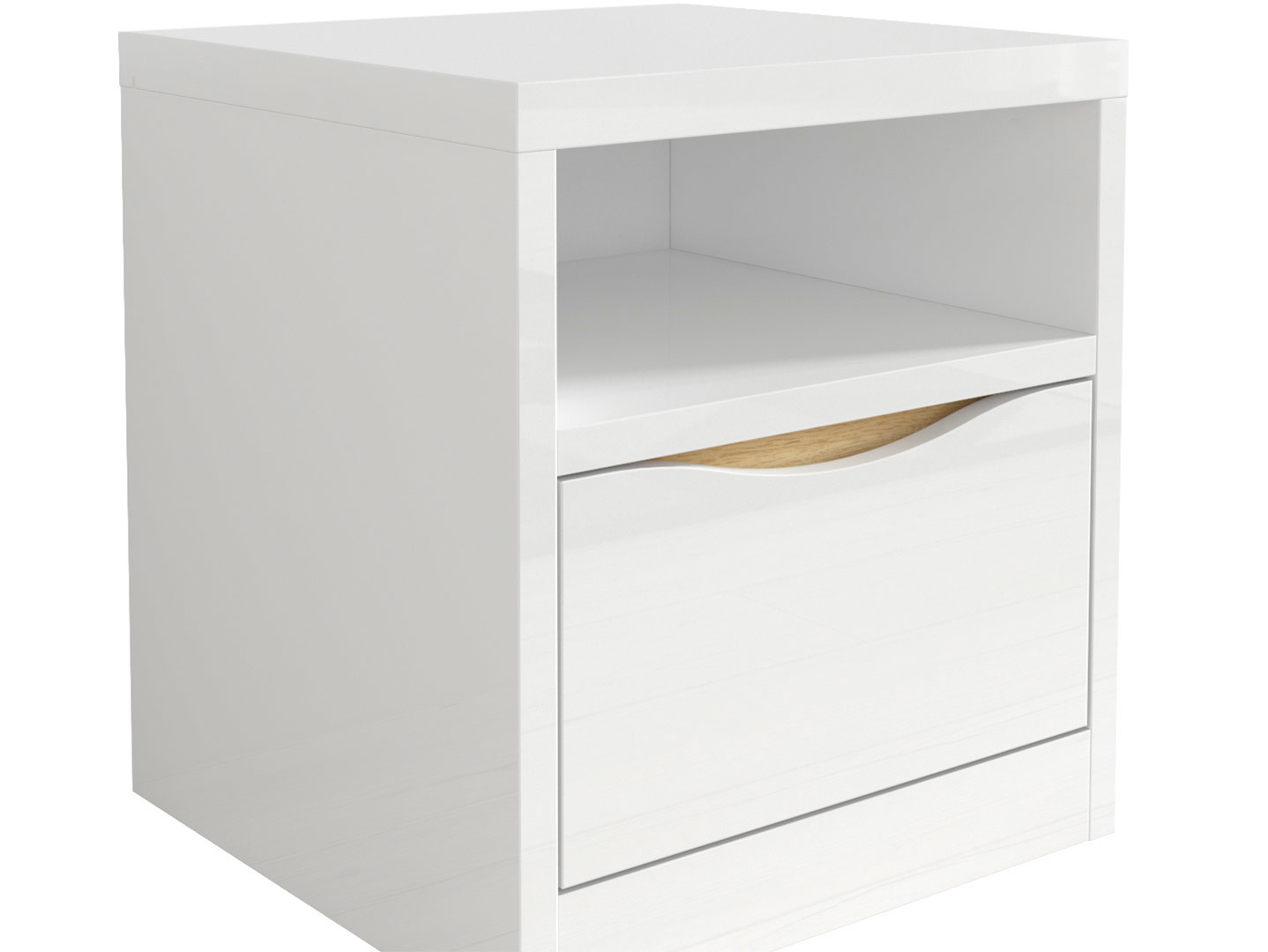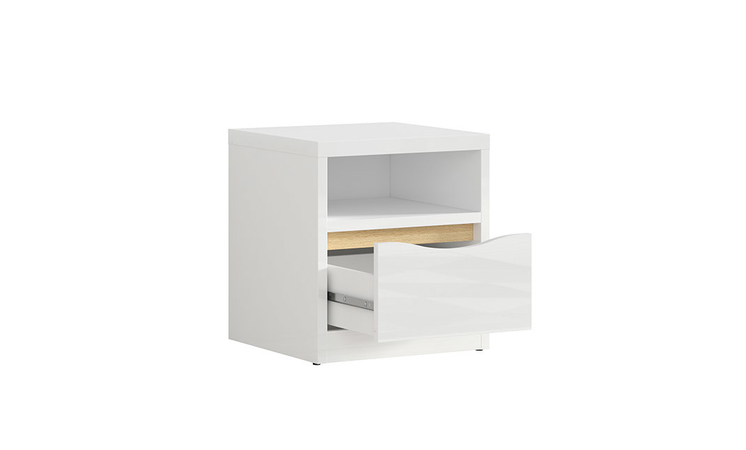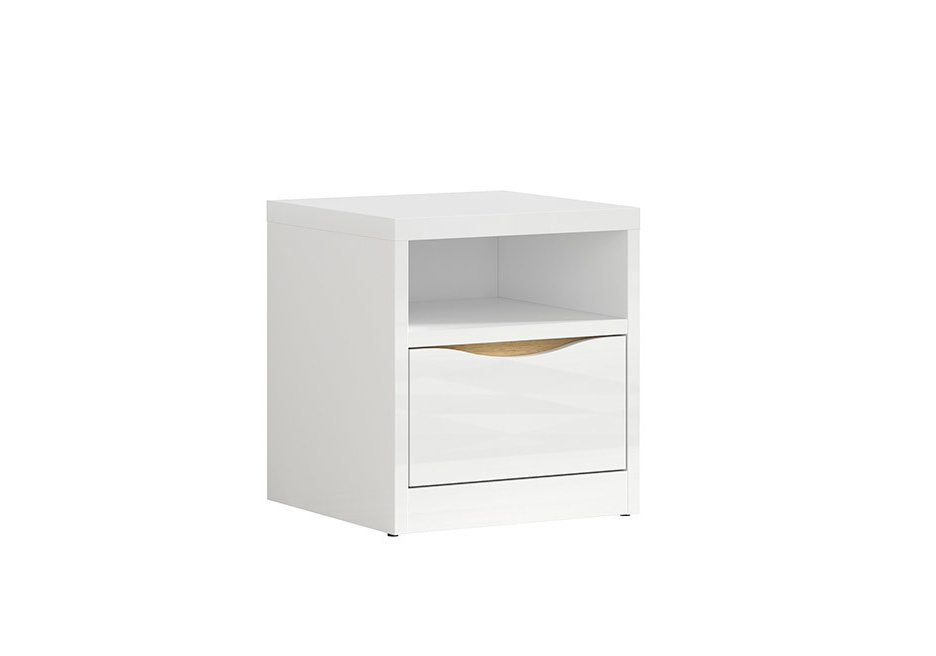 Noptieră modernă cu un design specific, care conține 1 raft deschis și 1 sertar pe șine cu role.