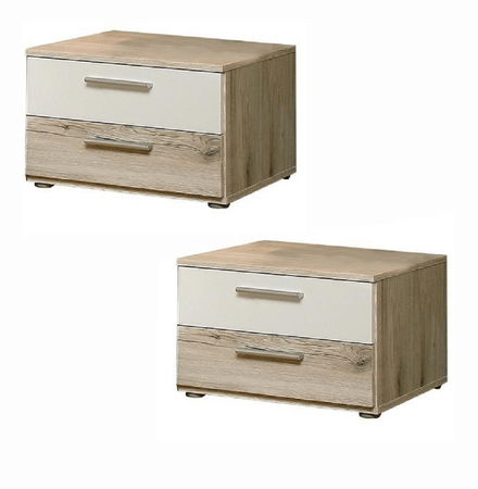 Comodă cu două sertare în nuanța stejarului nisipiu. Sertarul de sus are frontul alb. Material: PAL foliat. Se livrează în două bucăți (2buc).
