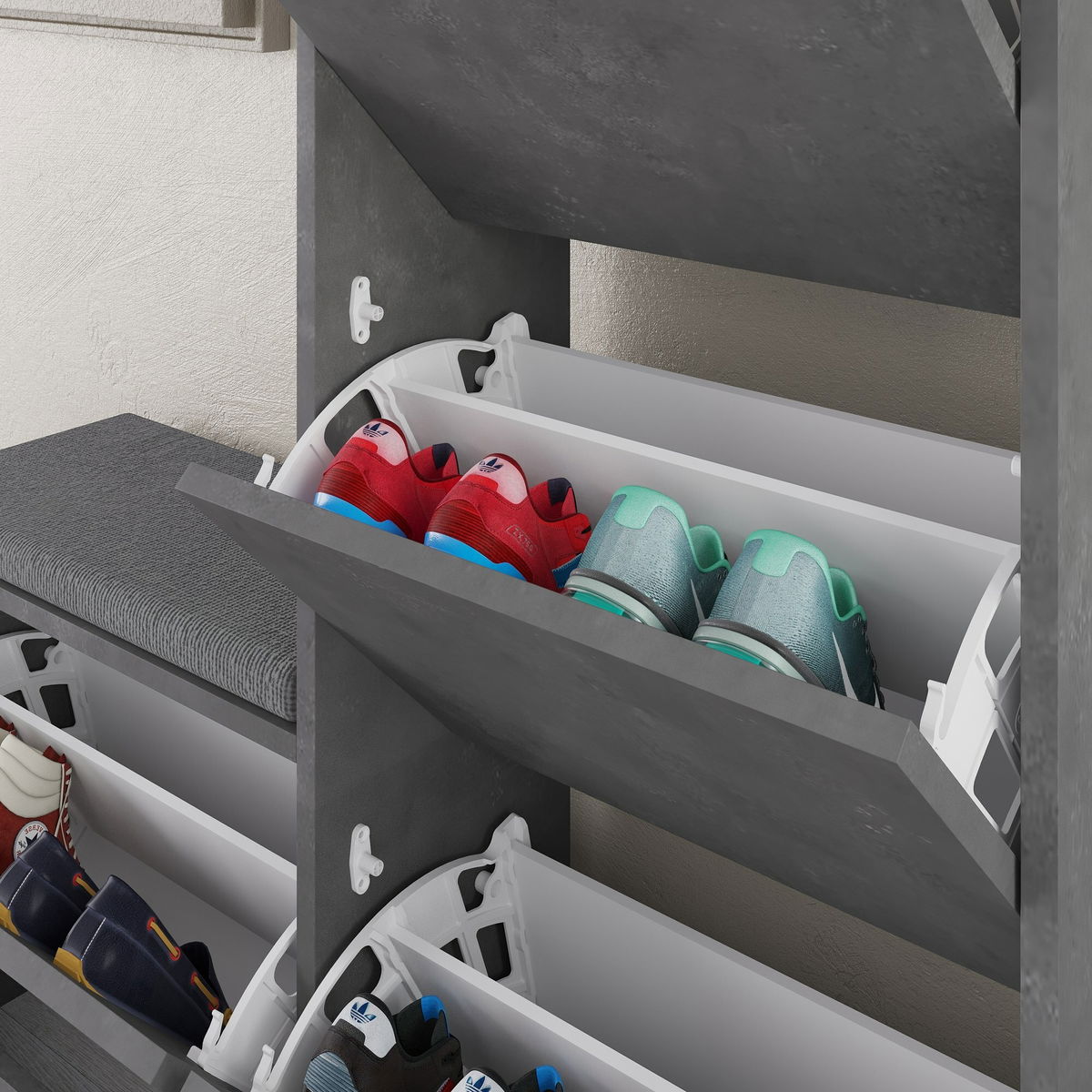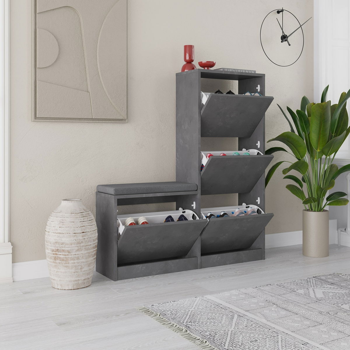 Designul modern, cu finisaj gri mat, se integrează armonios în multiple stiluri de interior, de la minimalist și industrial la contemporan, conferind un aer sobru și rafinat spațiului. Structura solidă și finisajele de calitate asigură durabilitate și rezistență în timp, iar liniile simple și elegante îi permit să fie ușor de combinat cu alte piese din categoria mobilier hol, mobilier de depozitare sau mobilier multifunctional.