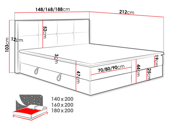 lungime: 212 cm, lățime: 148 cm, înălțime: 103 cm, Suprafața de dormit: 140 x 200 cm, Dimensiunea unui sp. depozitare(patul are două): lungime: 197 cm, lățime: 67 cm , înălțime: 25 cm,