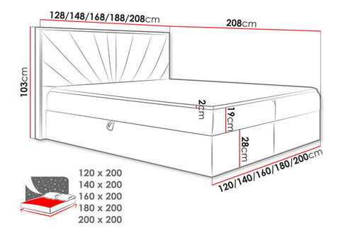 Placă brută de 16 mm + spumă T25 extrem de elastică, are două compartimente pentru depozitarea așternuturilor, pe ambele părți ale patului, ridicarea ambelor părți datorită arcurilor, ceea ce face ca operarea să fie foarte simplă și ușoară