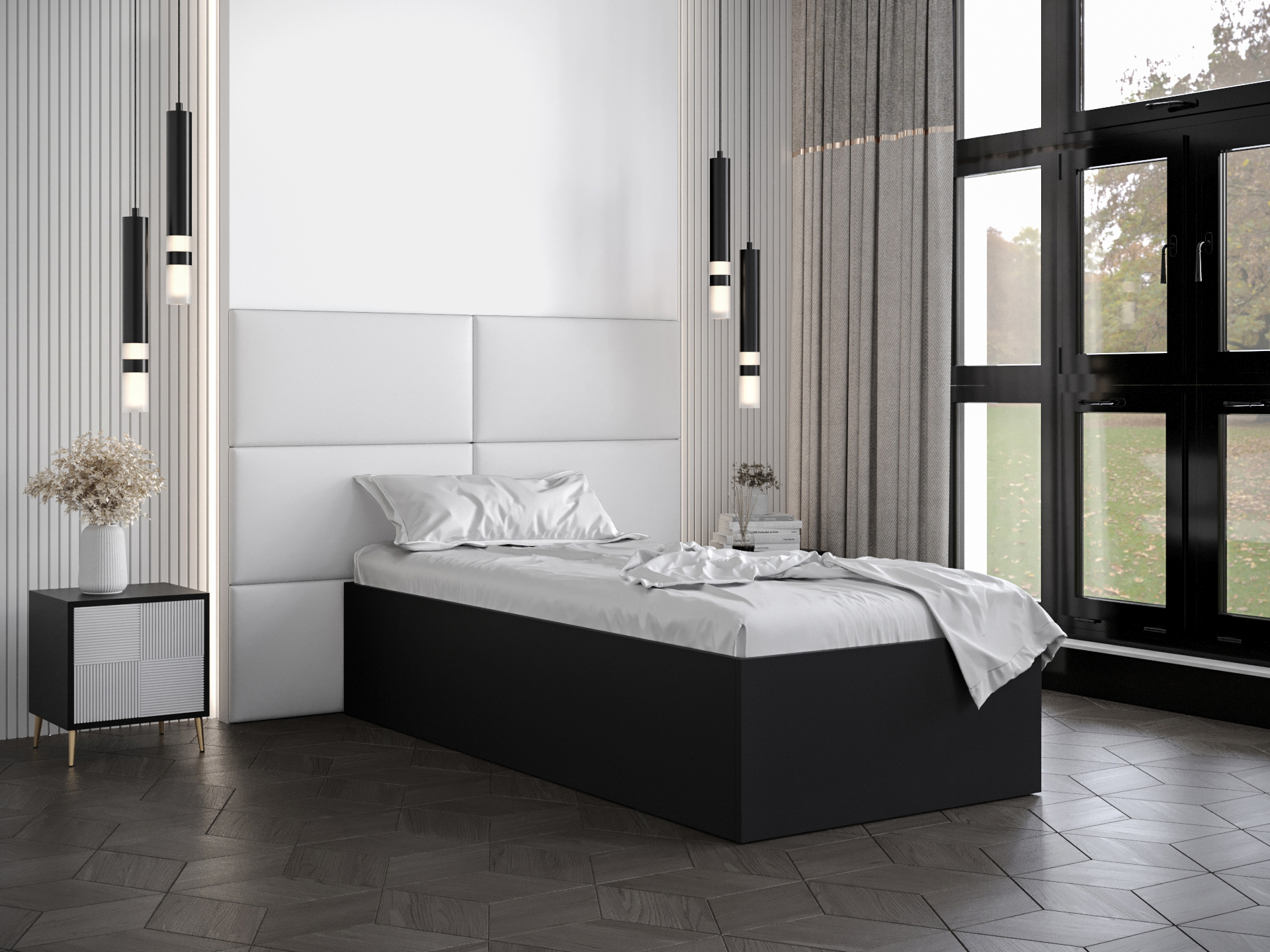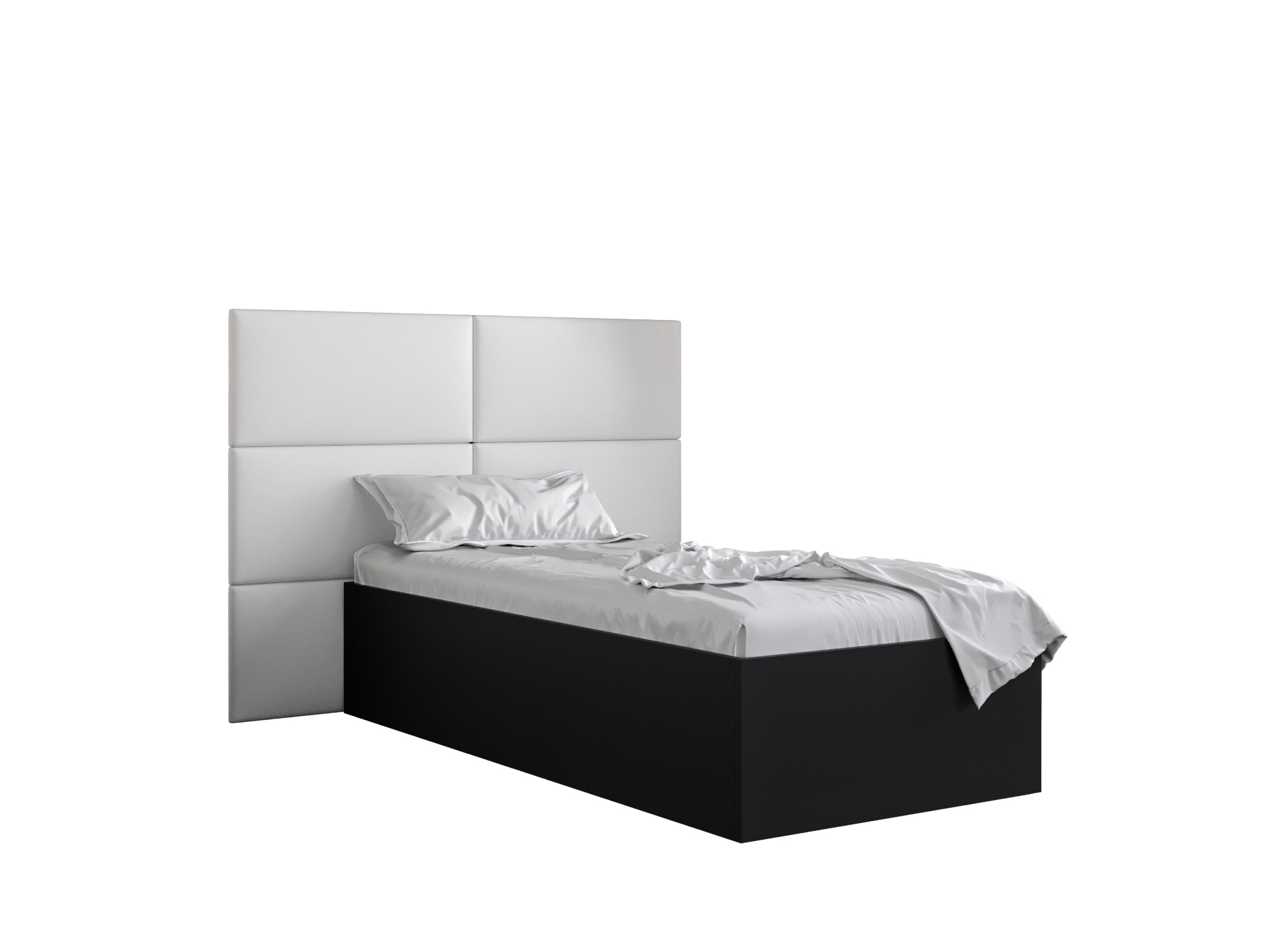 Pat de o persoană cu tăblie tapițată 90 cm Brittany 2 (Negru mat + Alb) (cu somieră)