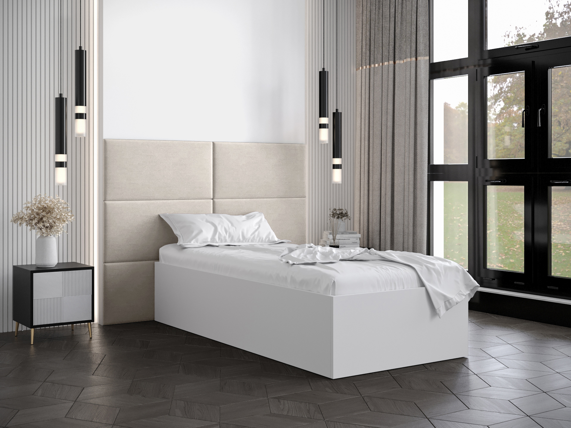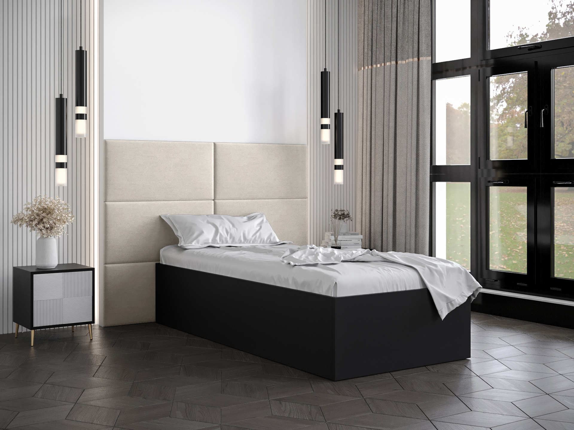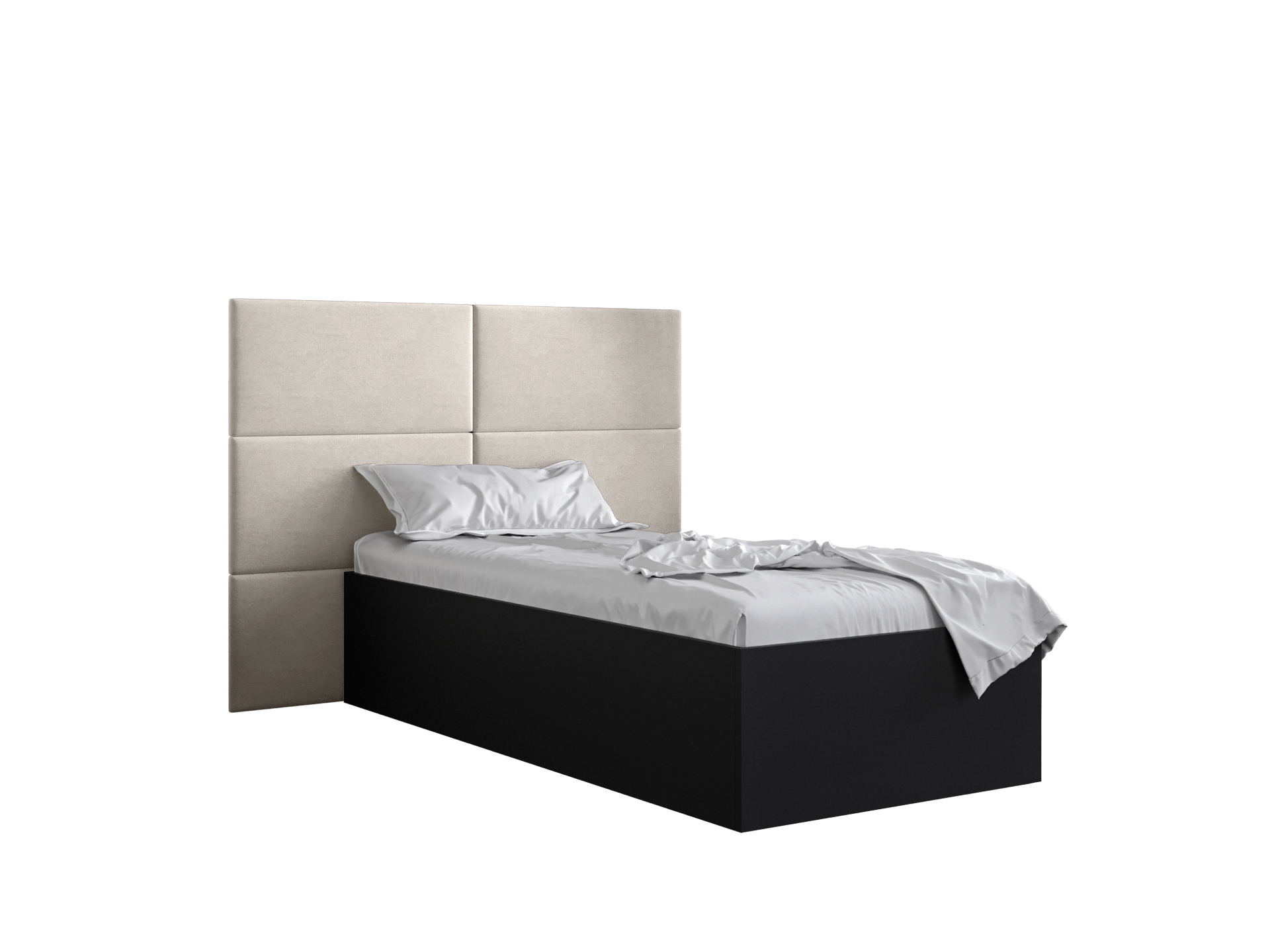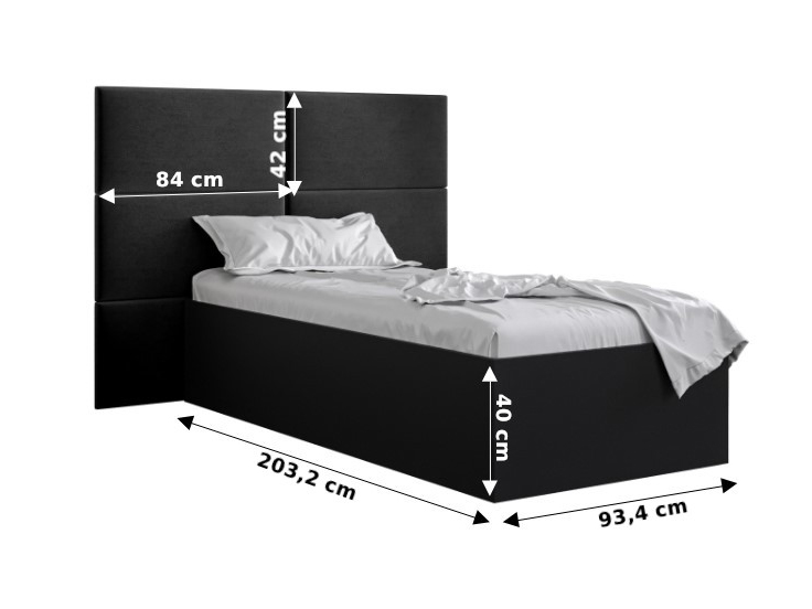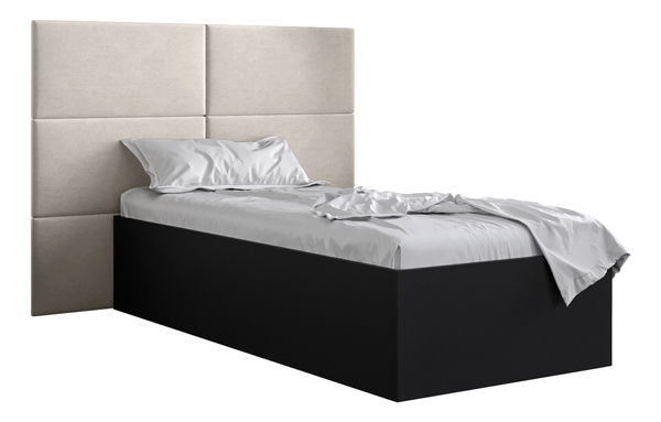 Pat de o persoană cu tăblie tapițată 90 cm Brittany 2 (Negru mat + crem) (cu somieră)