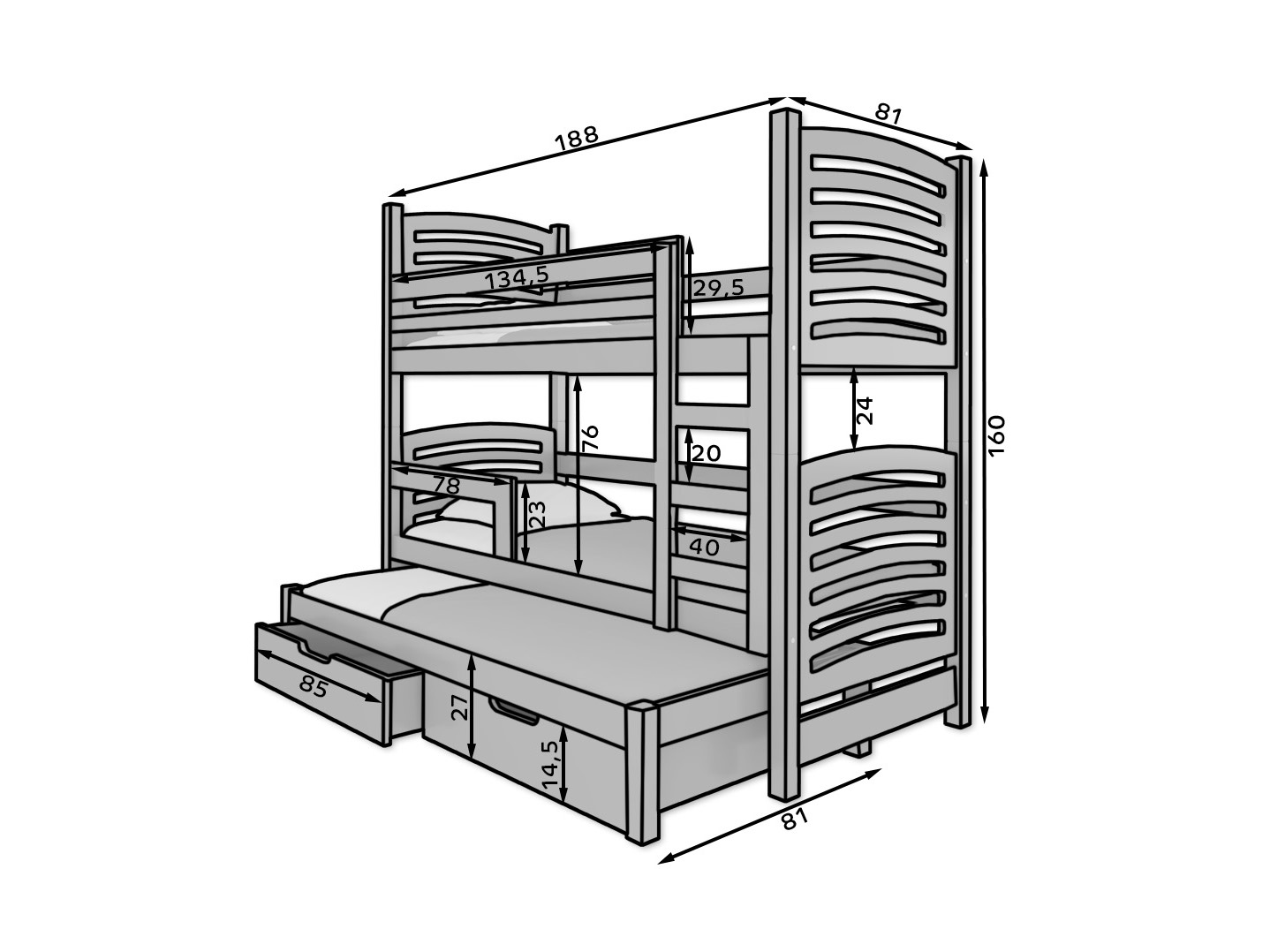lemn de pin, mijlocul patului și tăblile sertarelor sunt din placă MDF