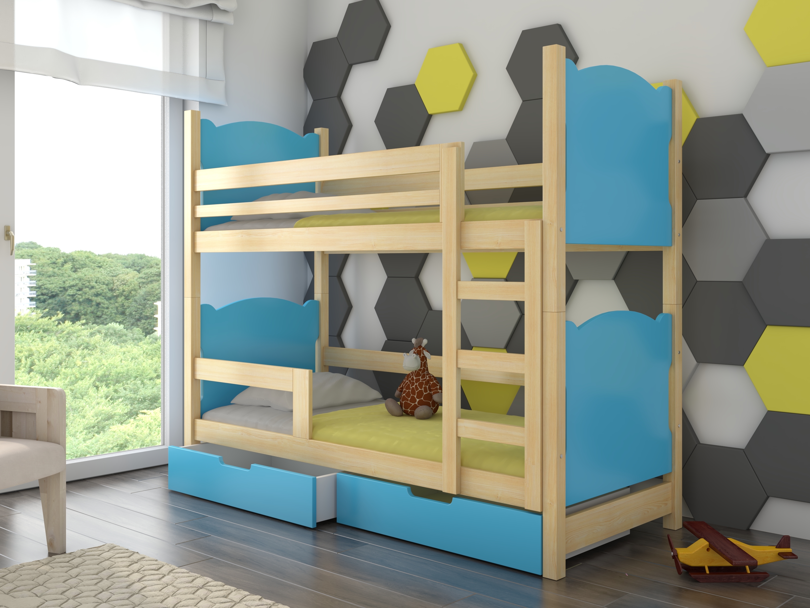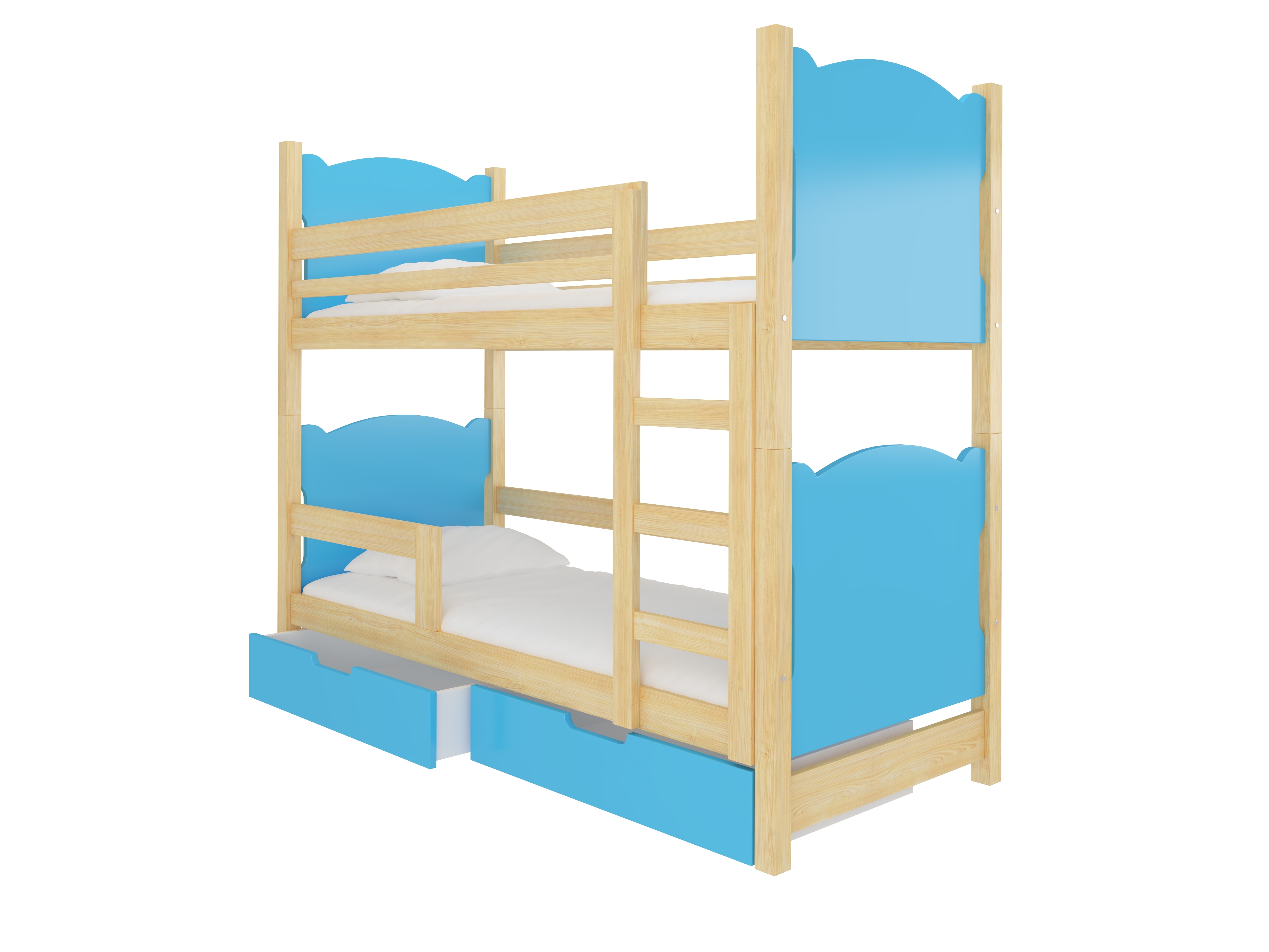 Pat etajat pentru copii 180x75 cm Marryann (cu somieră și saltea) (Pin + Albastru)