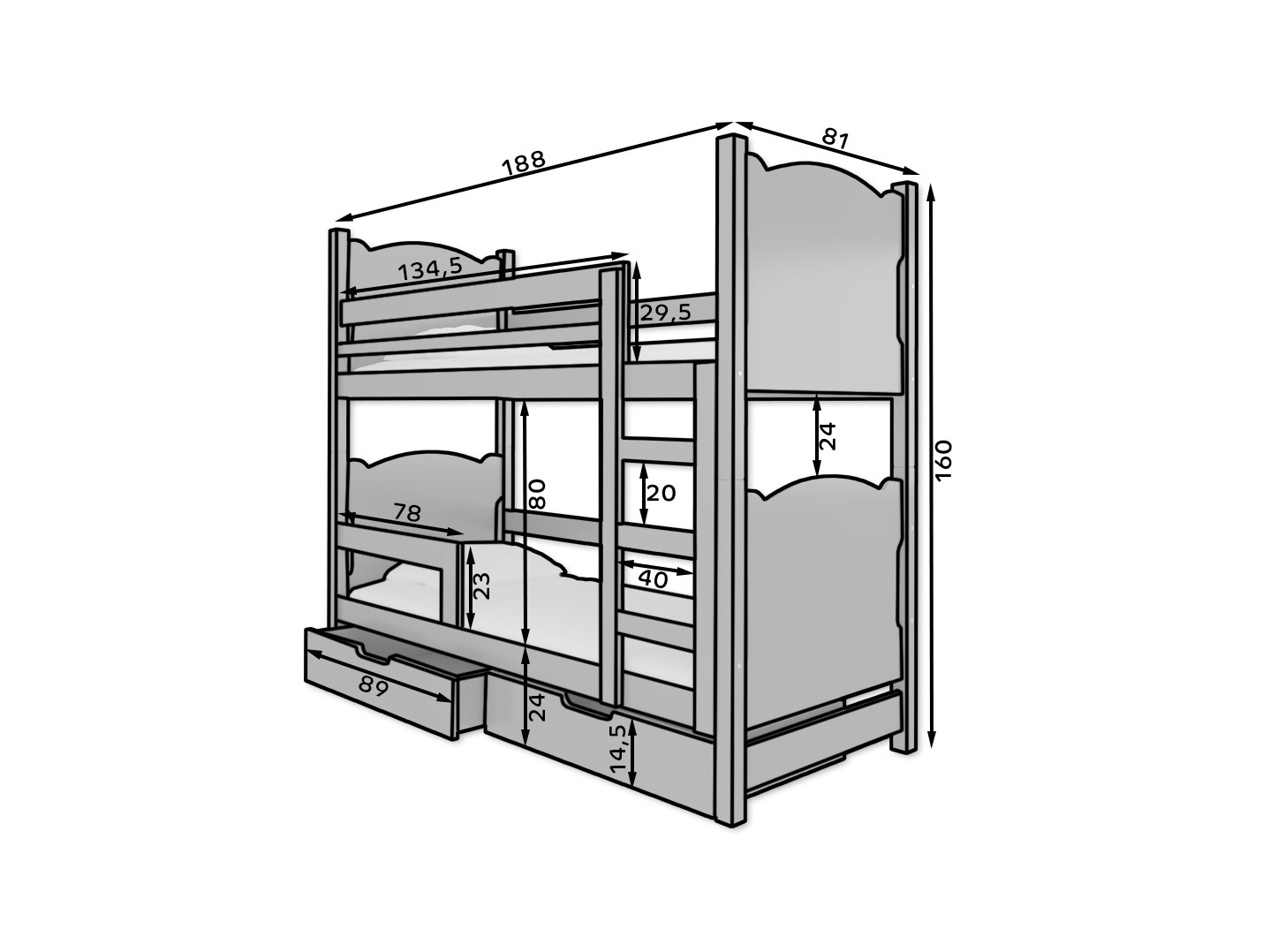 lemn de pin, mijlocul patului și tăblile sertarelor sunt din placă MDF
