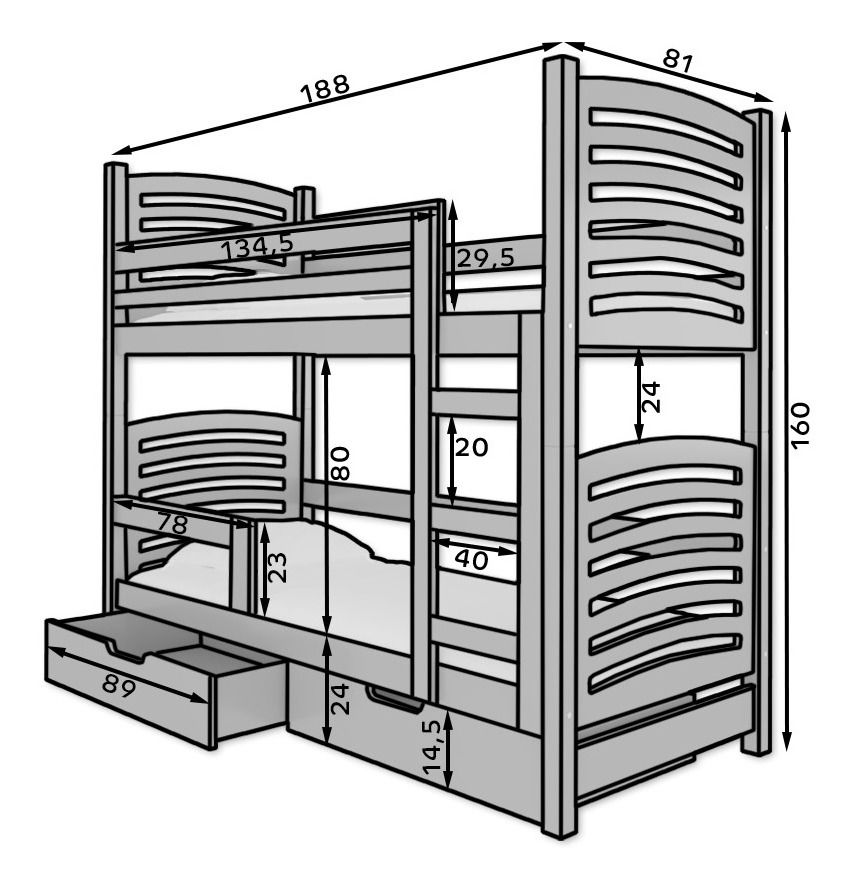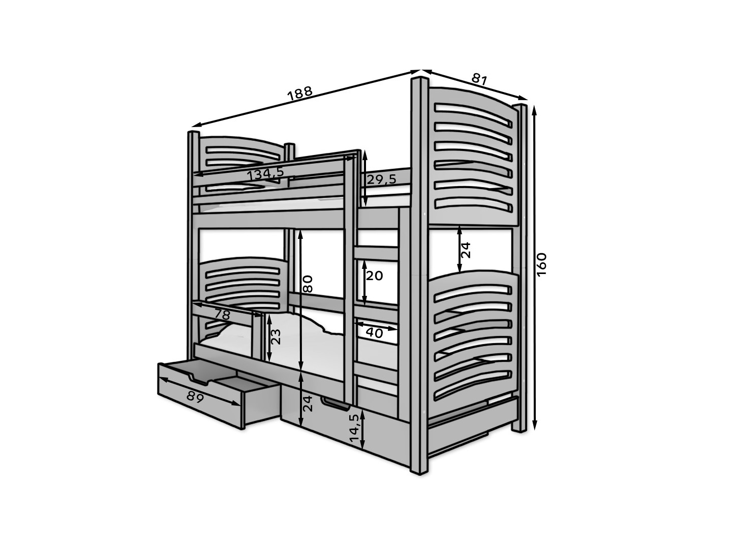 lemn de pin, mijlocul patului și tăblile sertarelor sunt din placă MDF