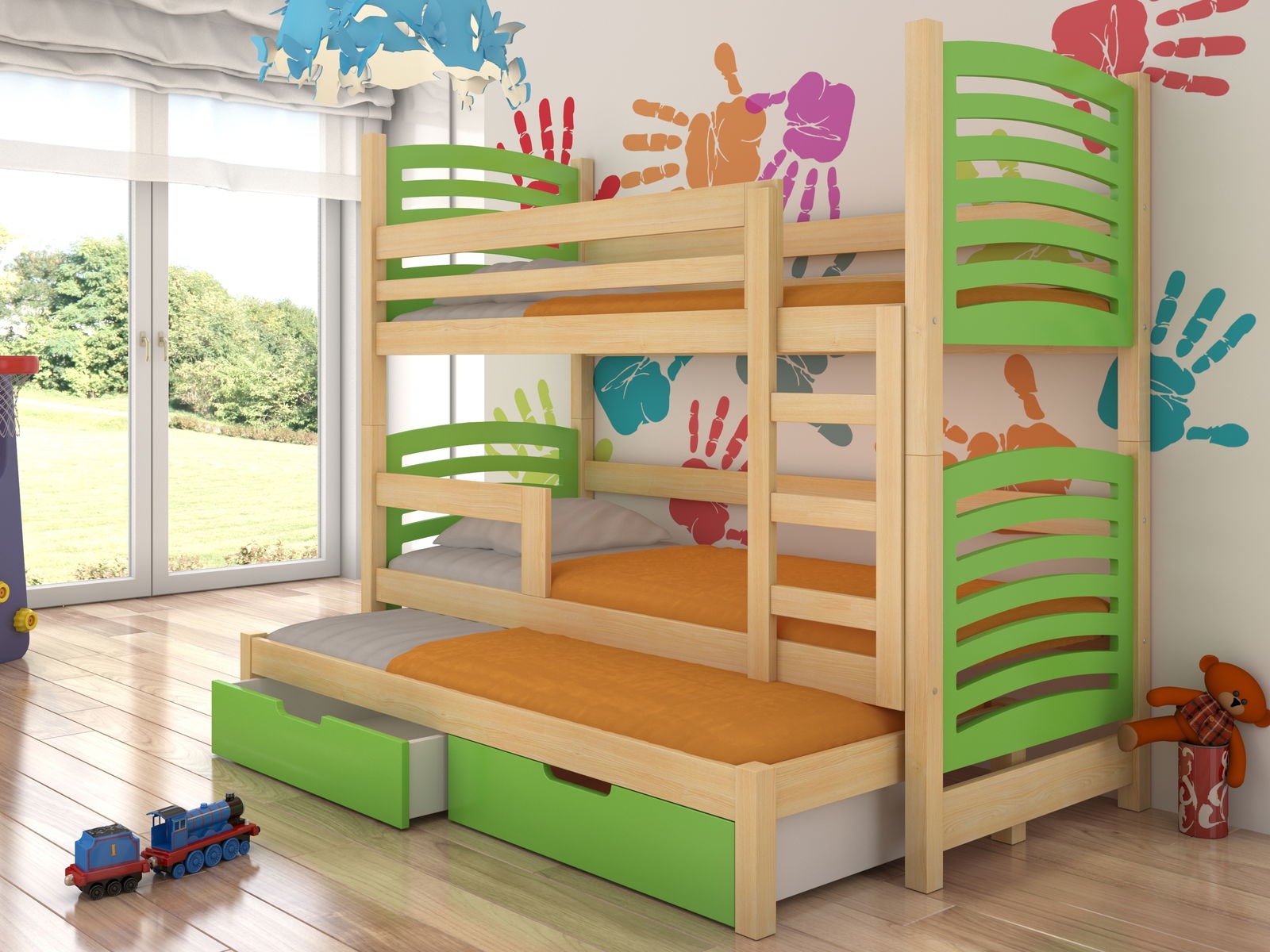 Pat etajat pentru copii 180x75 cm Stanislava (cu somieră și saltea) (Pin + Verde)