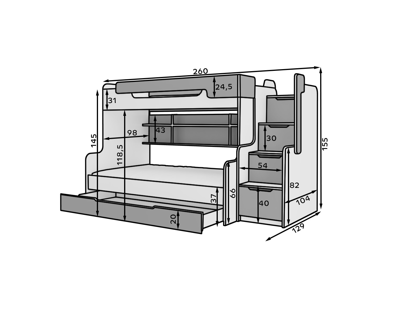 da, 1x sertar extensibil, trepte laterale cu spațiu de depozitare și sistem de rafturi deasupra patului inferior