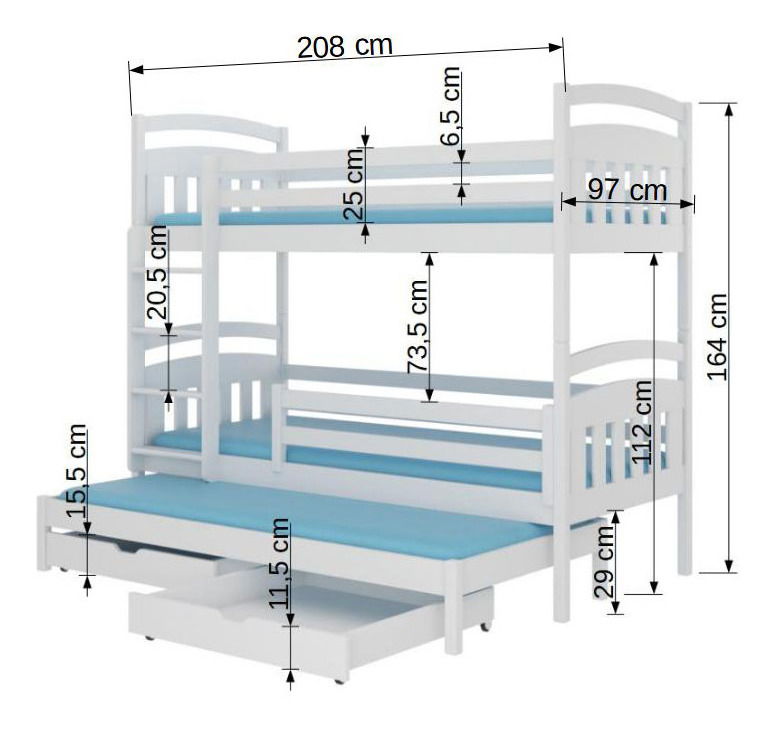 90x200 cm, patul inferior extensibil are o saltea cu 10 cm mai scurtă