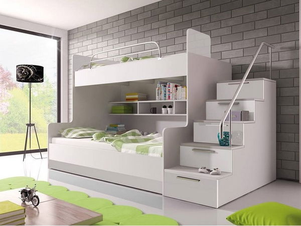 Un set foarte practic pentru camera copiilor, care include un pat suprapus cu două zone de dormit, scări și un spațiu mare de depozitare sub formă de rafturi. Ideal pentru interioare mai mici. Fabricat din placă MDF de înaltă calitate, prin care ușa și sertarele au o suprafață acrilică acoperită cu lac de 0,8 mm grosime.