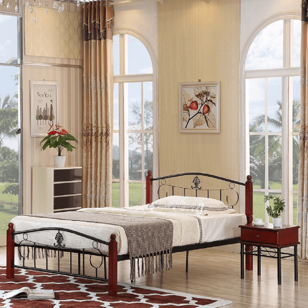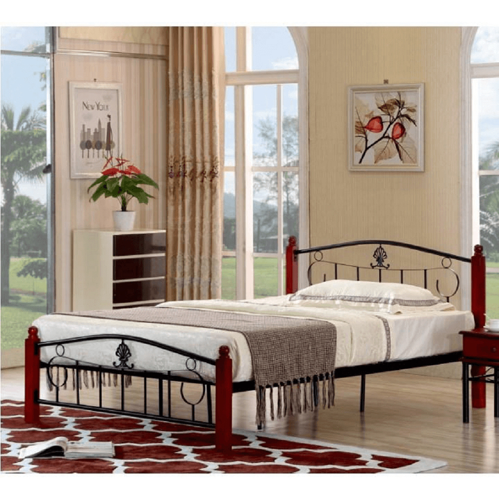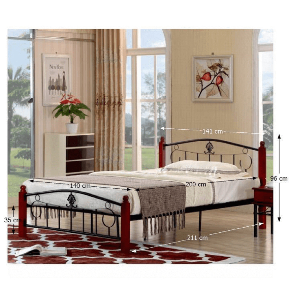 Patul matrimonial Margery este fabricat din metal negru și este completat de picioare din lemn într-o nuanță de stejar închis. Se livrează dezasamblat.