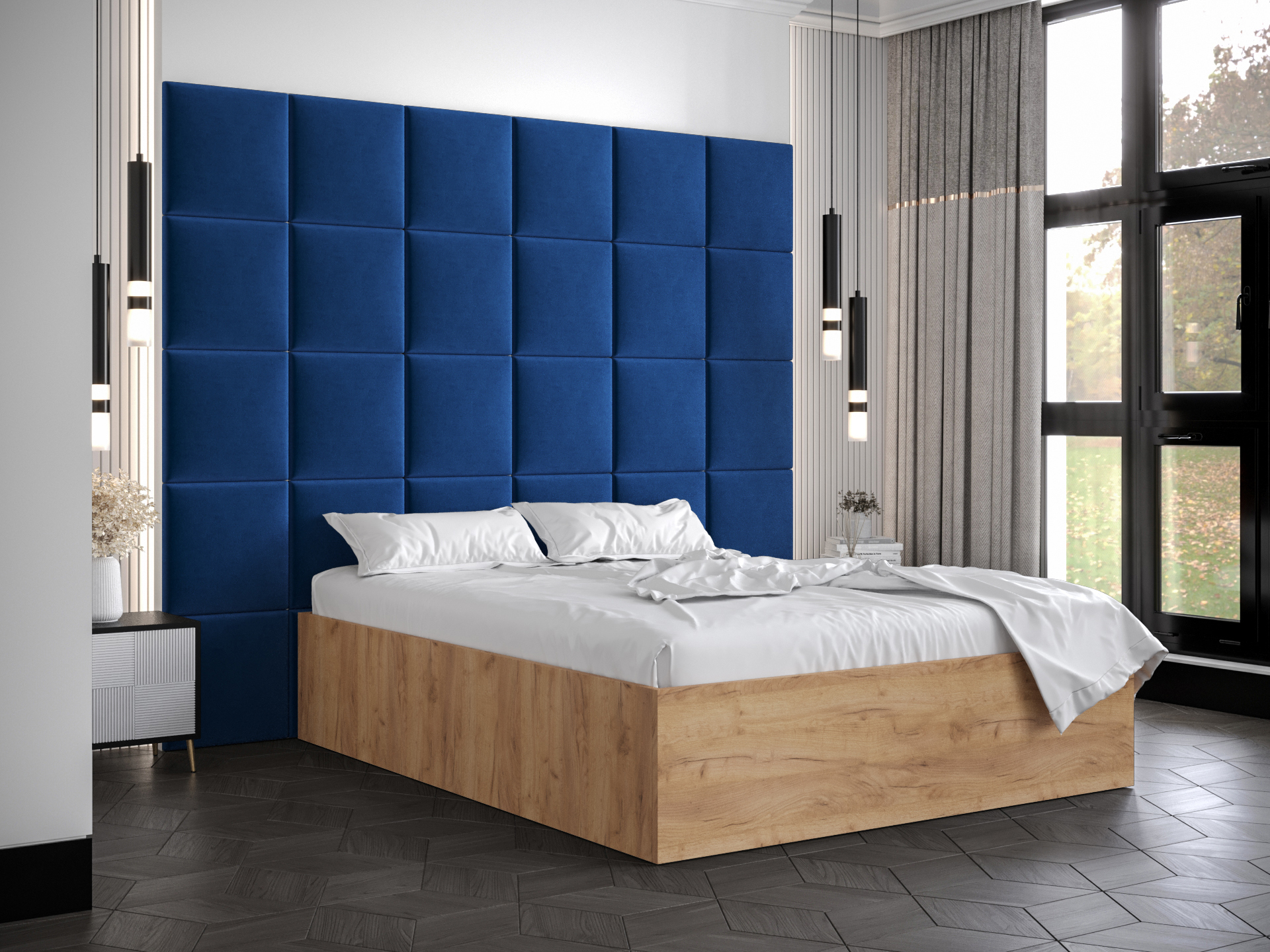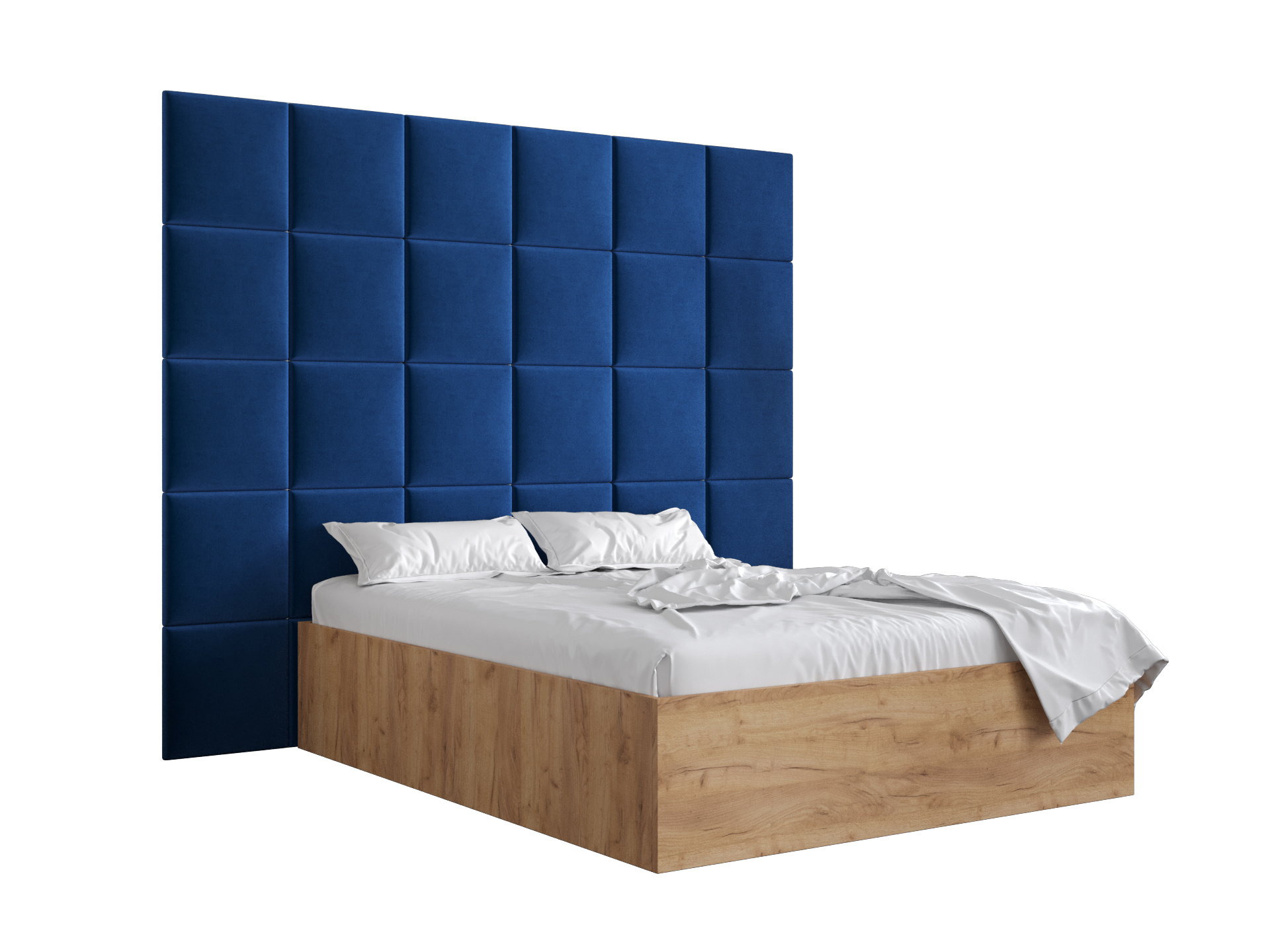 Pat matrimonial cu tăblie tapițată 160 cm Brittany 3 (Stejar craft auriu + albastru) (cu somieră)