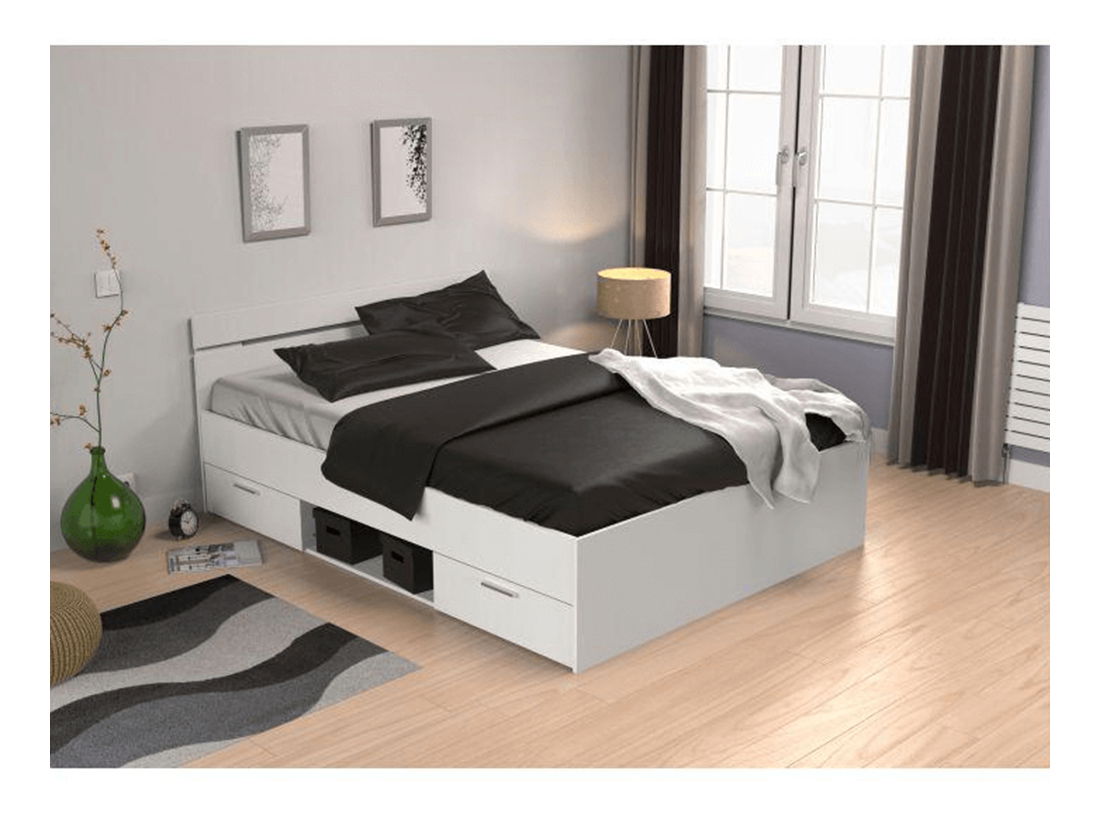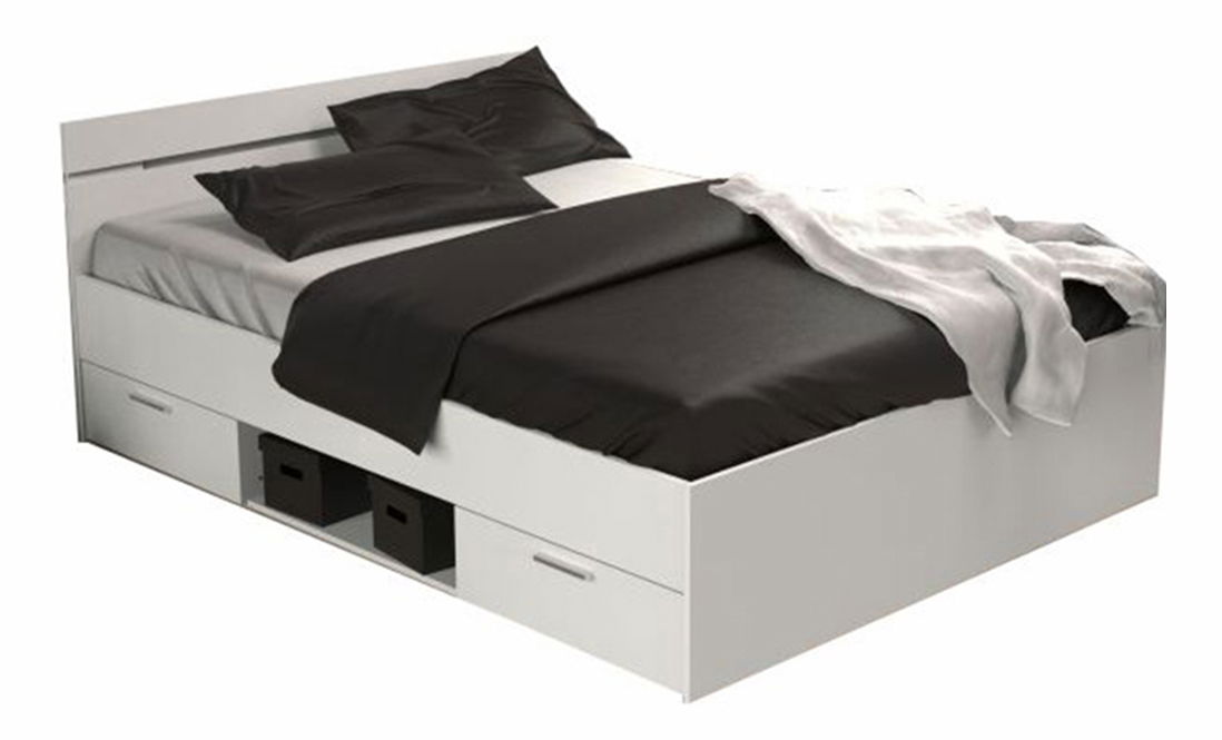 AfișeazăPatul Myriam este piesa practică pentru fiecare dormitor dar și camera copiilor saude studenți. Oferă spațiu de dormit de 160x200 cm, conține două sertare și sp. de depozitare deschis, sub pat.Sertarelele se pot asambla pe partea dreaptă sau stângă. Faabricat din pal laminat pe versiunea color de alb.