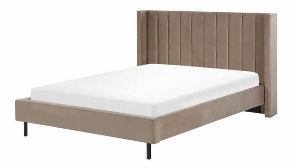 Pat elegant cu design modern și spătar înalt. Forma dreptunghiulară a patului poate părea clasică la prima vedere, însă datorită cusăturilor verticale de pe tăblie, oferă un aspect modern și elegant. Pat este tapițat în întregime cu tapițerie de catifea de culoare gri bej, ceea ce îi conferă un aspect sofisticat. Picioarele mici și discrete garantează stabilitatea și rezistența întregului cadru.