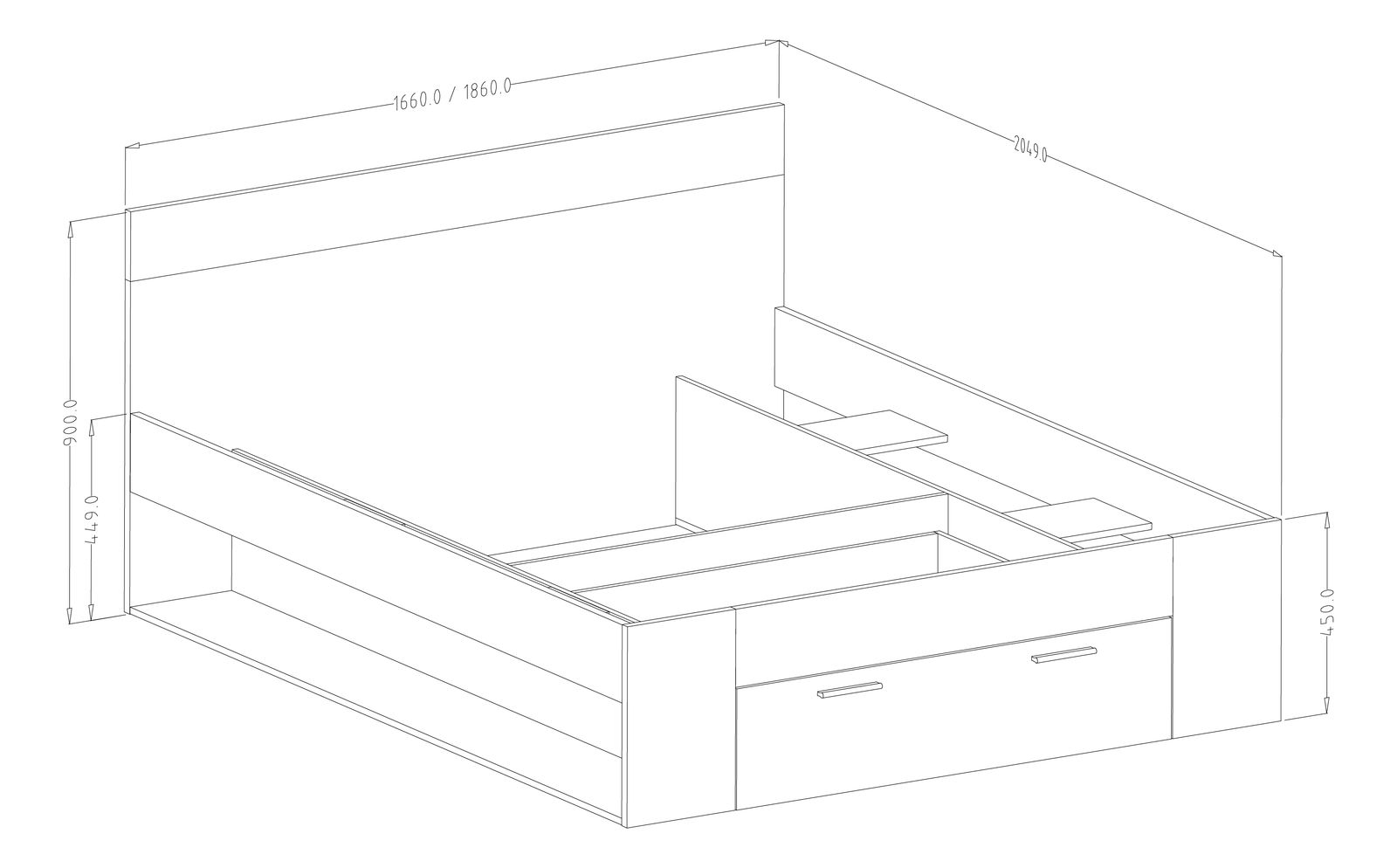 Acest pat matrimonial oferă spaţiu de depozitare, care se deschide din partea din faţă și două sertare deschise pe lateral. Tăblia oferă un suport drept pentru spate la șederea pe pat și protejează peretele de zgârieturi.