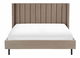 Pat elegant cu design modern și spătar înalt. Forma dreptunghiulară a patului poate părea clasică la prima vedere, însă datorită cusăturilor verticale de pe tăblie, oferă un aspect modern și elegant. Pat este tapițat în întregime cu tapițerie de catifea de culoare gri bej, ceea ce îi conferă un aspect sofisticat. Picioarele mici și discrete garantează stabilitatea și rezistența întregului cadru.