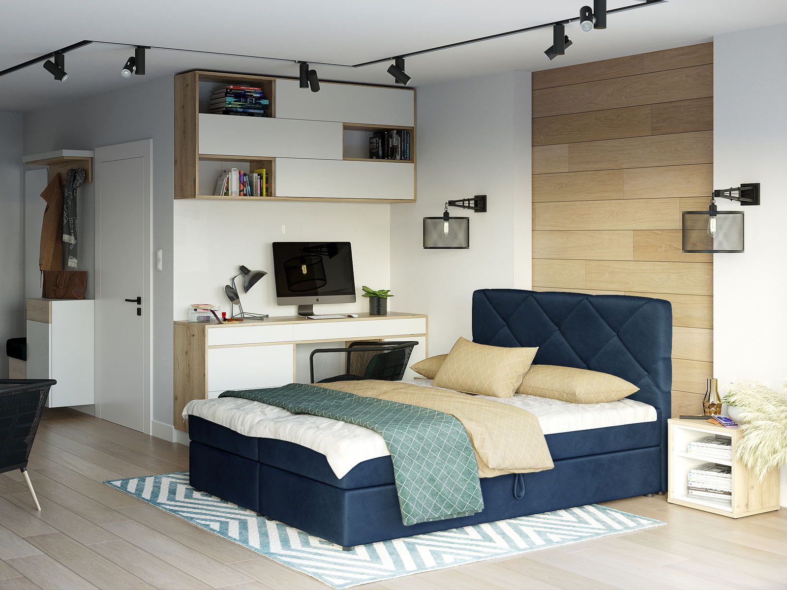 Pat înalt și confortabil Boxspring este hitului perioadei curente. Are o înălțime mai ridicată, oferind astfel un confort mai ridicat la ridicarea din pat. Satelaua inferioară este din arcuri bonell și înlocuiește somiera lamelară. Partea superioră conține topper cu înălțime de 4 cm care poate fi comandat la preț suplimentare. Spațiu de depozitare este accesibil din lateral.