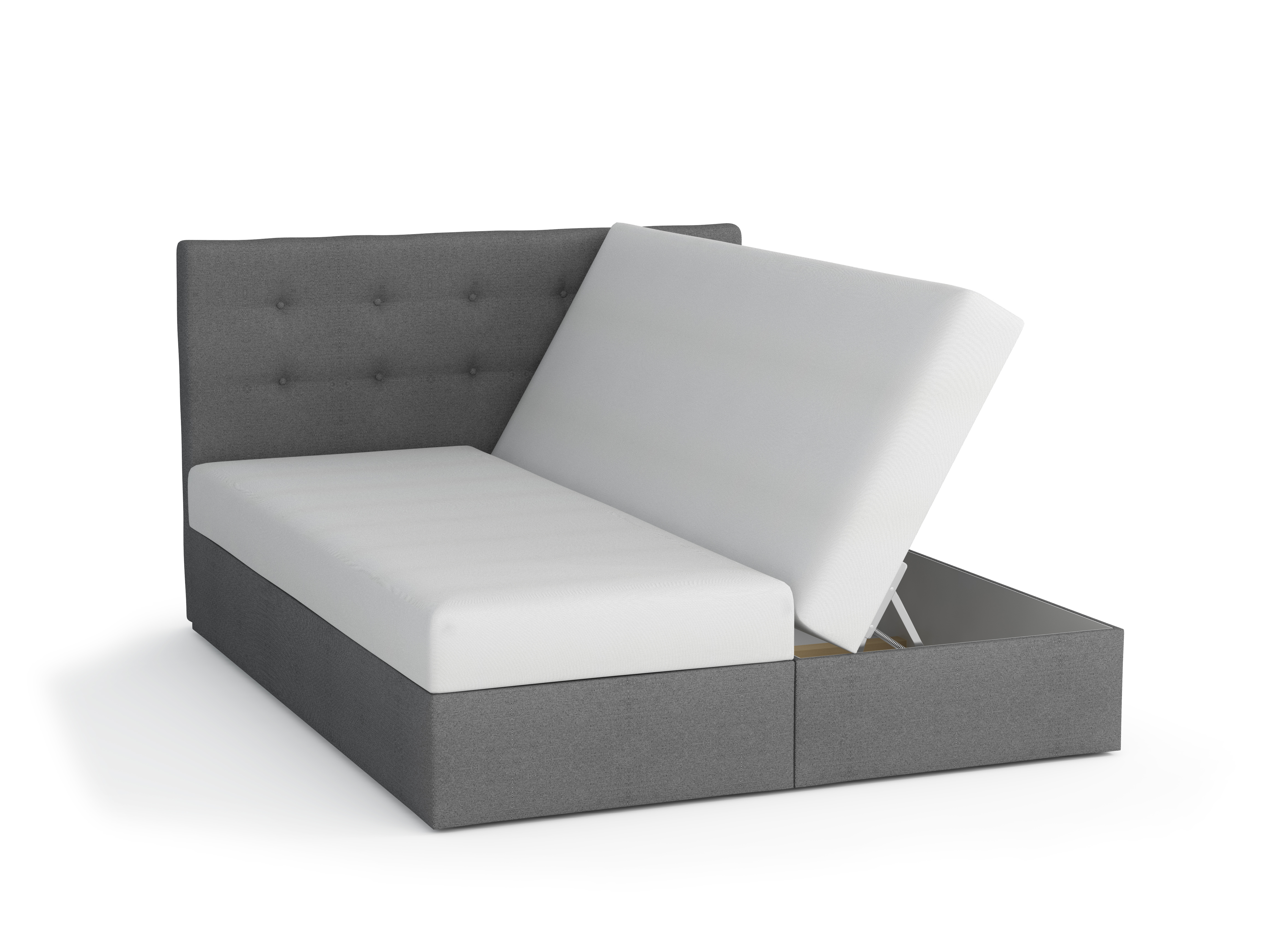 Patul Boxspring este unul dintre cele mai dorite paturi din ziua de astăzi. Salteaua inferioară este realizată din arcuri Bonell și înlocuiește somiera. Pe partea superioară se află un topper cu grosime de 4cm care poate fi comandat . Patul conține spațiu de depozitare accesibil din lateral.